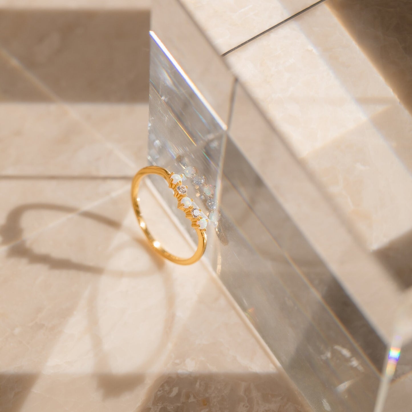 The Layla Opal Diamond Ring is a gold minimalist piece with delicate white gemstones, shown on a reflective surface against a soft beige background—ideal for a subtle boho chic ring statement.