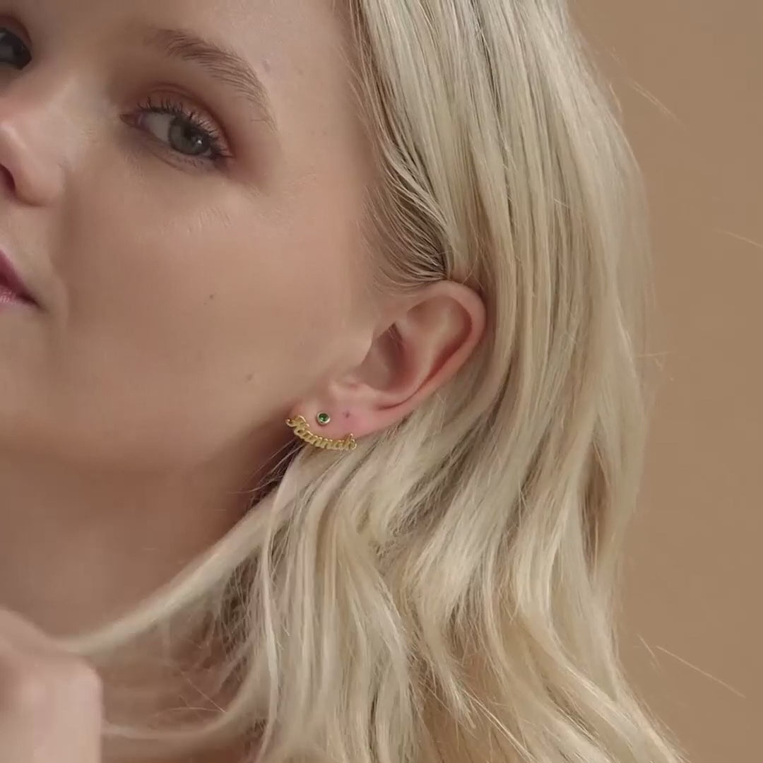 Featuring green birthstones and a personalized Hannah nameplate, the London Name Ear Jackets are stylish wrap-around earrings shown on a textured beige surface.