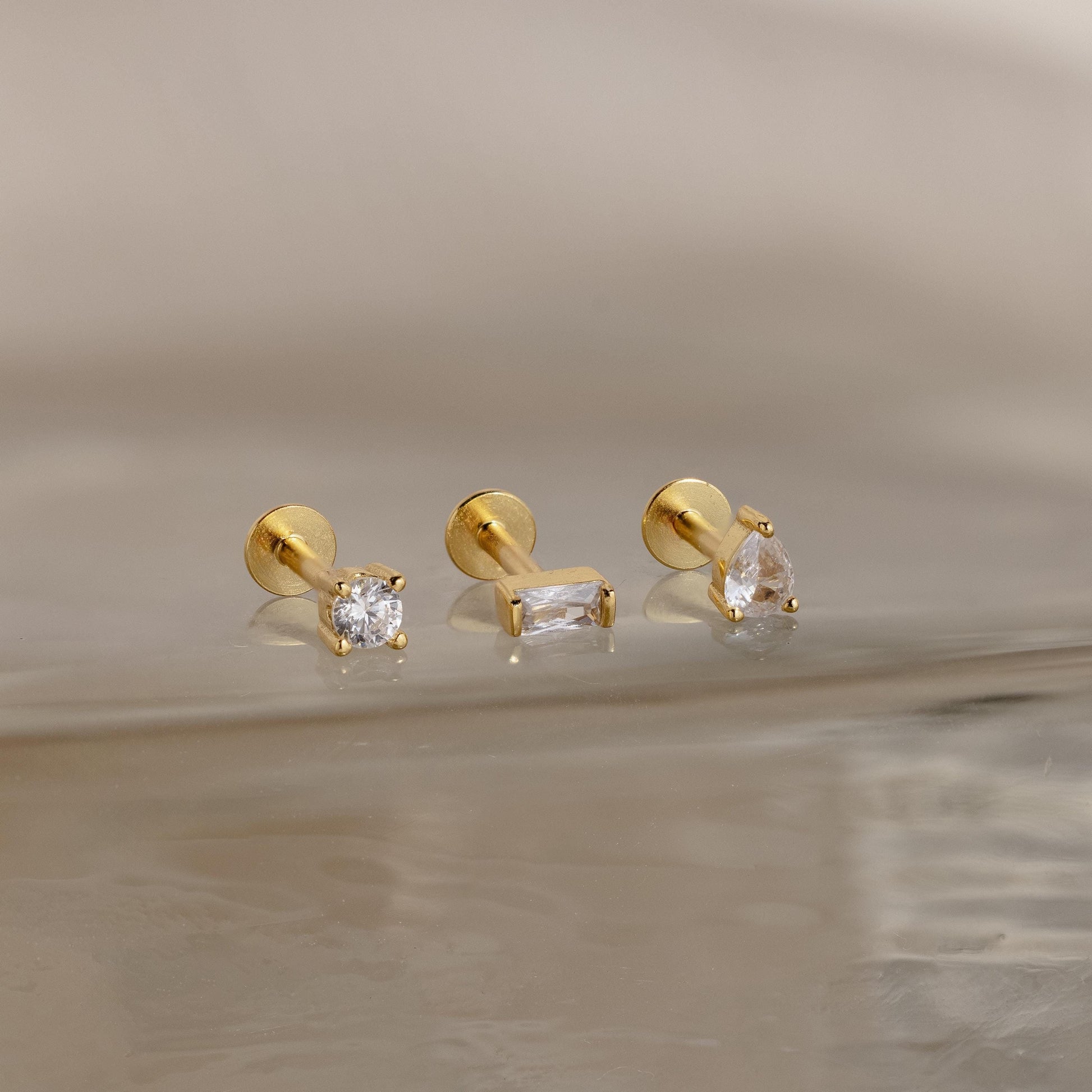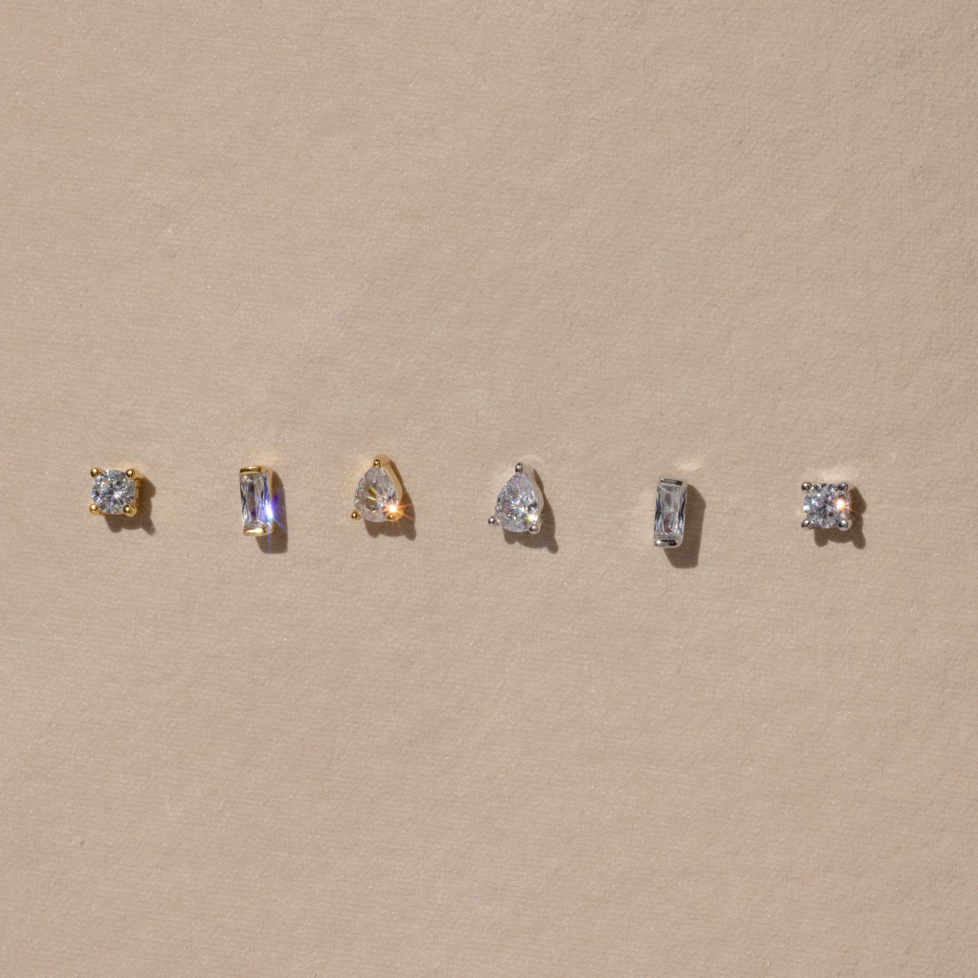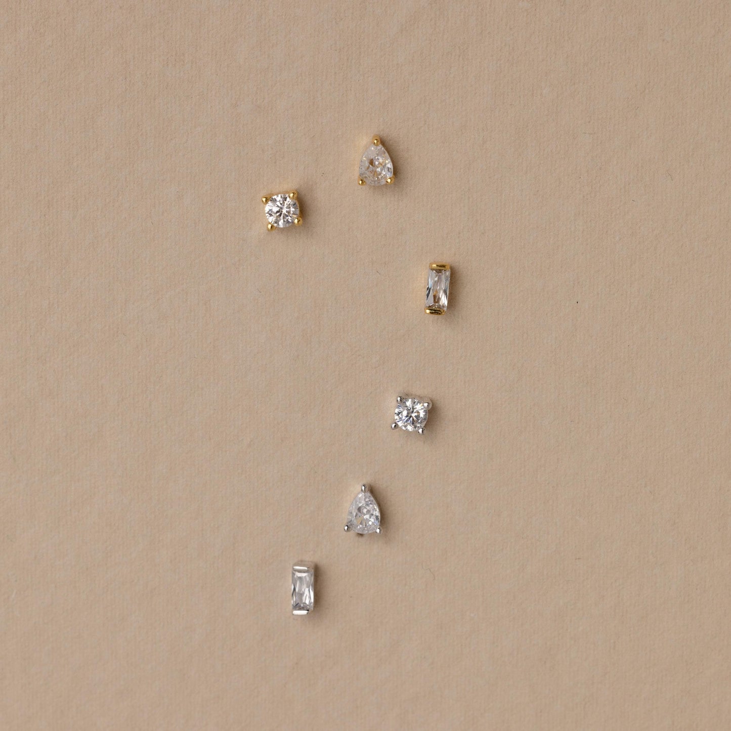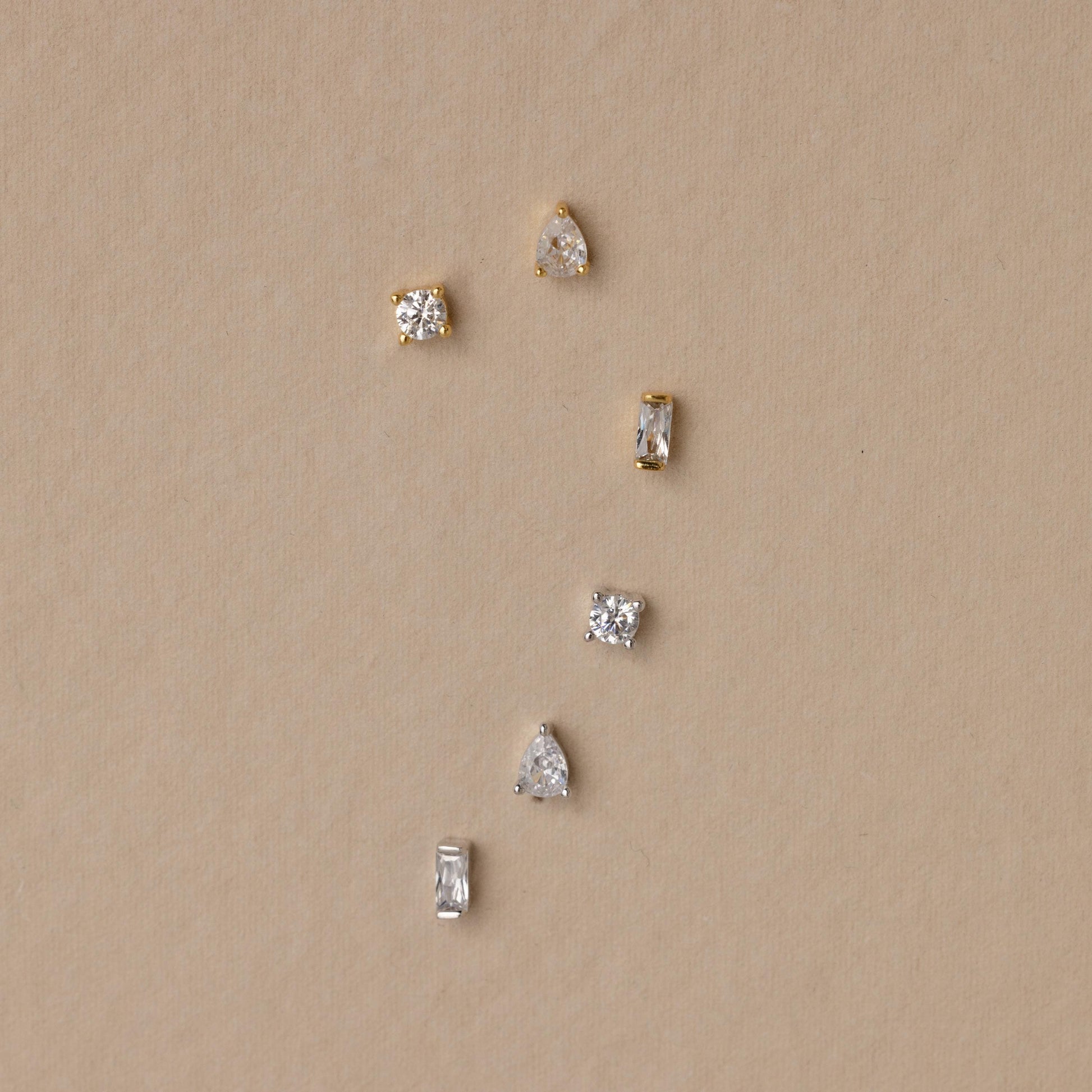 The Mixed Diamond Flat Back Stud Set includes three gold earrings—round, rectangular, and teardrop-shaped—with clear CZ stones, ideal for an elegant look and displayed on a reflective, light-colored surface.