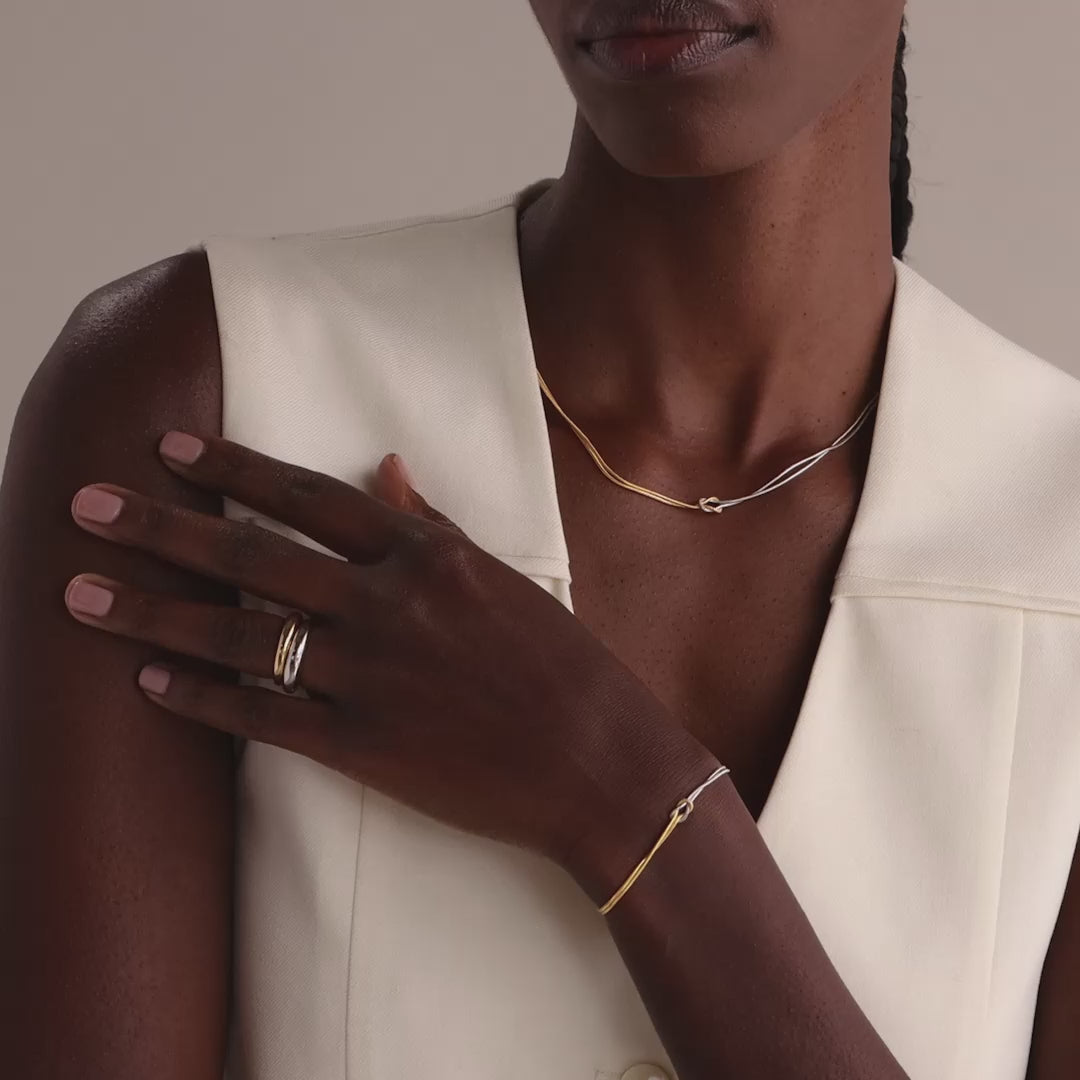Where modern design meets timeless sentiment — our Mixed Metal Knot Necklace features a seamless blend of gold and snake silver chains knotted together in graceful harmony. It’s a contemporary piece that celebrates everlasting love with an elevated yet understated edge.