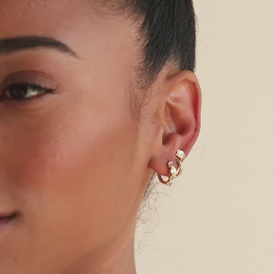 - Le modèle présente un look empilable mignon et divin avec nos Moonstone Huggies et Madison Hoops .