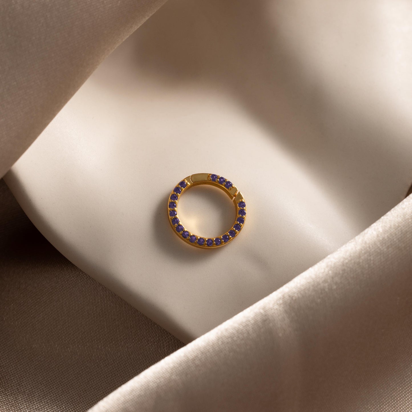 The Pave Amethyst Charm Clip, a gold circular earring adorned with purple gemstones, is displayed on smooth beige satin fabric.