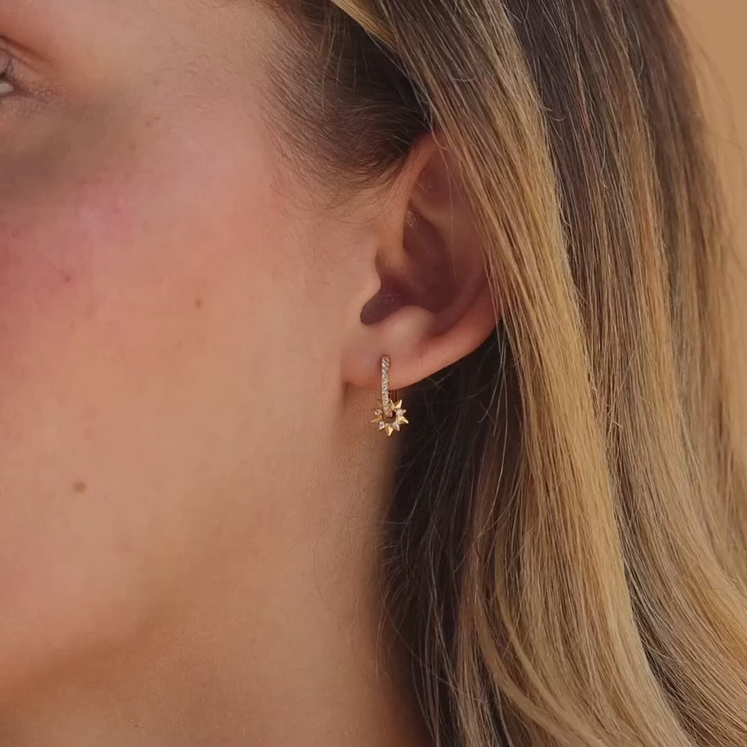 • Featuring Pave Huggie Hoops with a dangling ~6.5mm Sun Charm