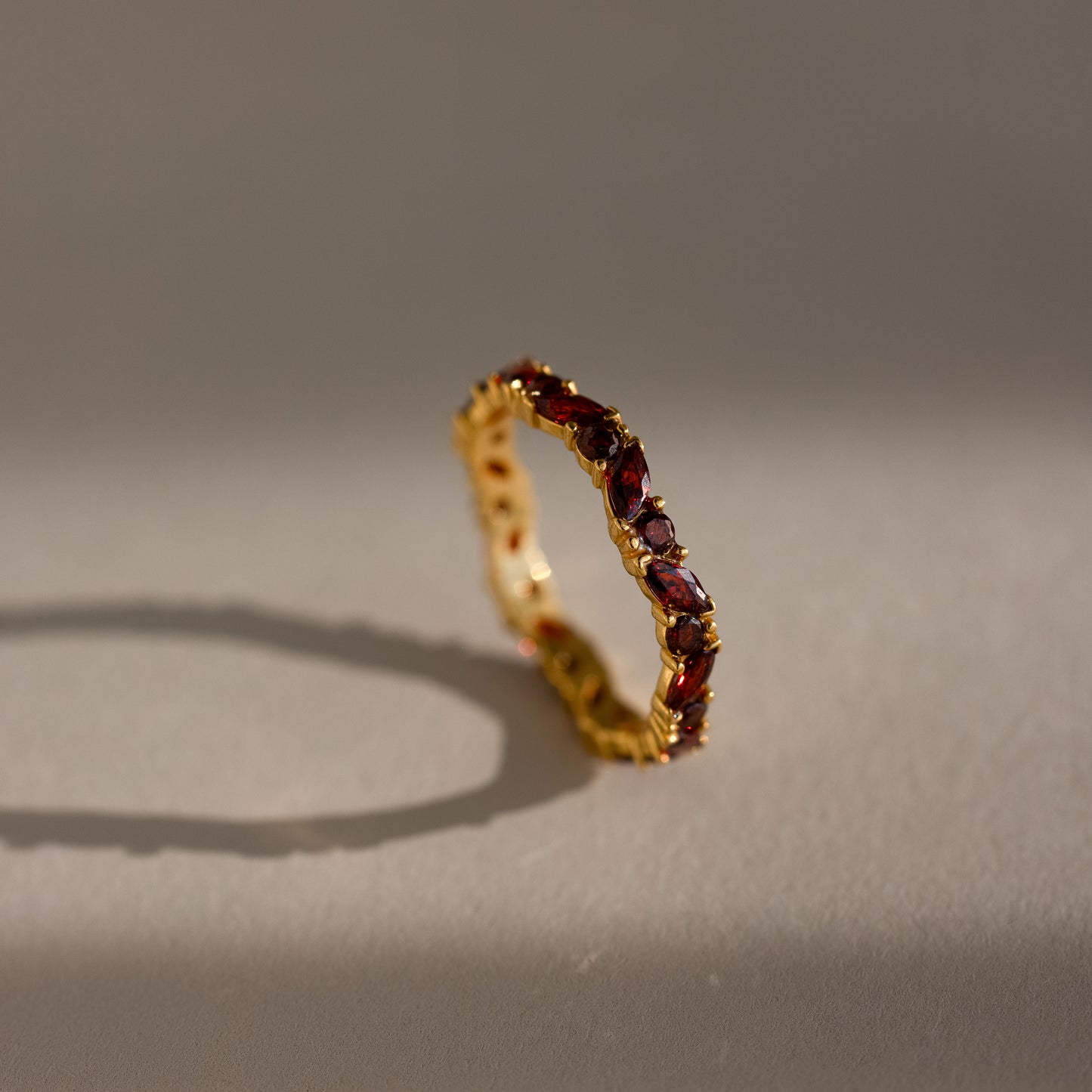 D'une délicatesse éclatante, notre bague grenat marquise décalée est ornée d'un anneau d'éternité intemporel, alternant pierres taille marquise et taille ronde. Idéale comme alliance, cadeau de demoiselle d'honneur ou tout simplement pour le plaisir, c'est un souvenir intemporel conçu pour scintiller sous tous les angles ✨