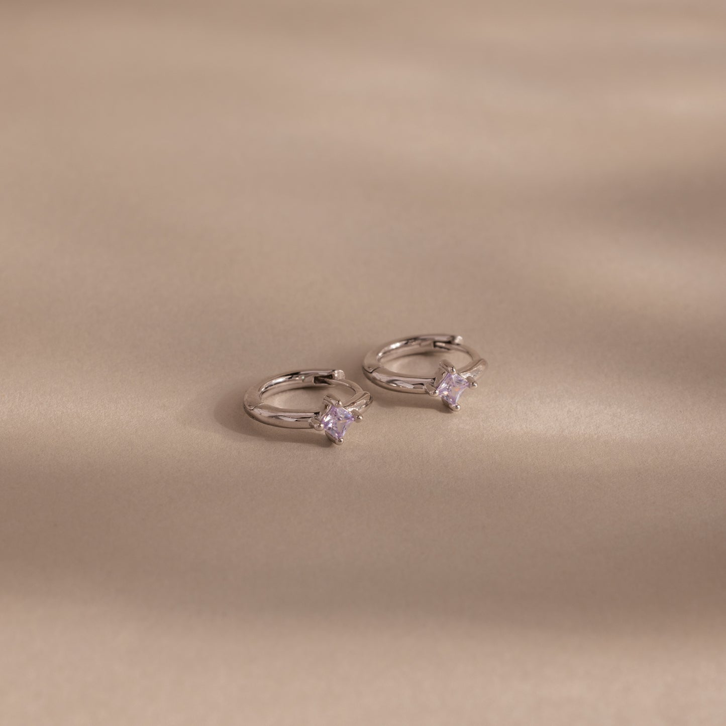 A row of pairs of small gold hoop earrings, each adorned with a square-cut gemstone in 3 colors: light purple, blush pink, and aqua blue, displayed against a textured off-white background.
