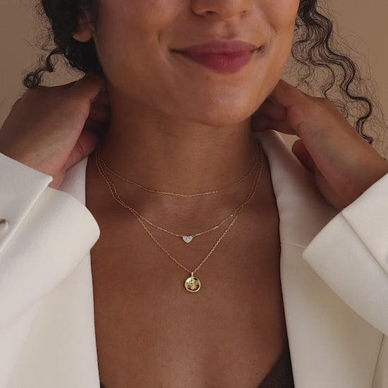 • Featuring a ~11.5mm Deeply Engraved Circle Pendant Charm with Round CZ Gemstone on a dainty Cable Chain