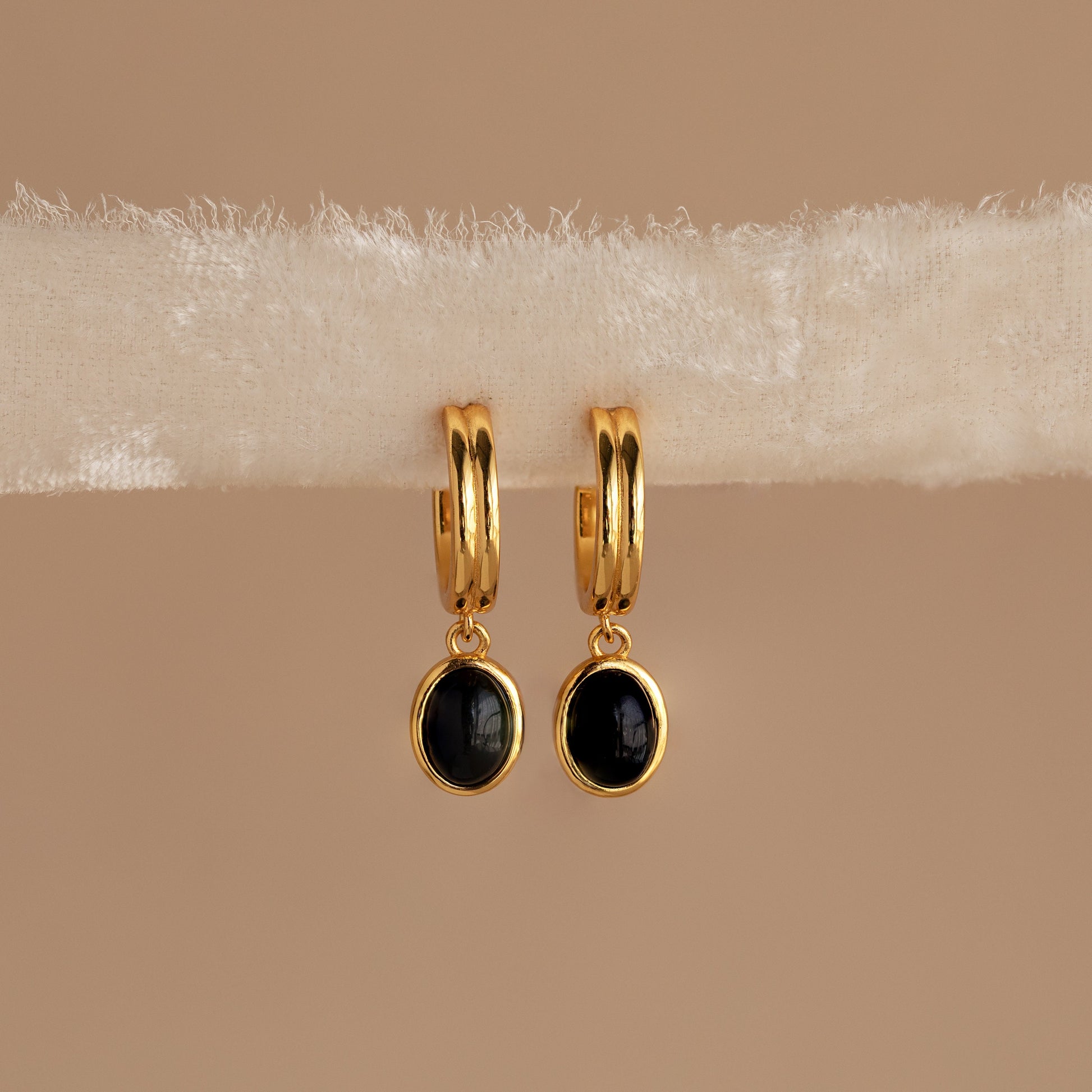 Black Gemstone Drop Hoops with dangling black oval stones rest on a textured beige dish—perfect as stylish everyday earrings or striking black gemstone accents for any occasion.