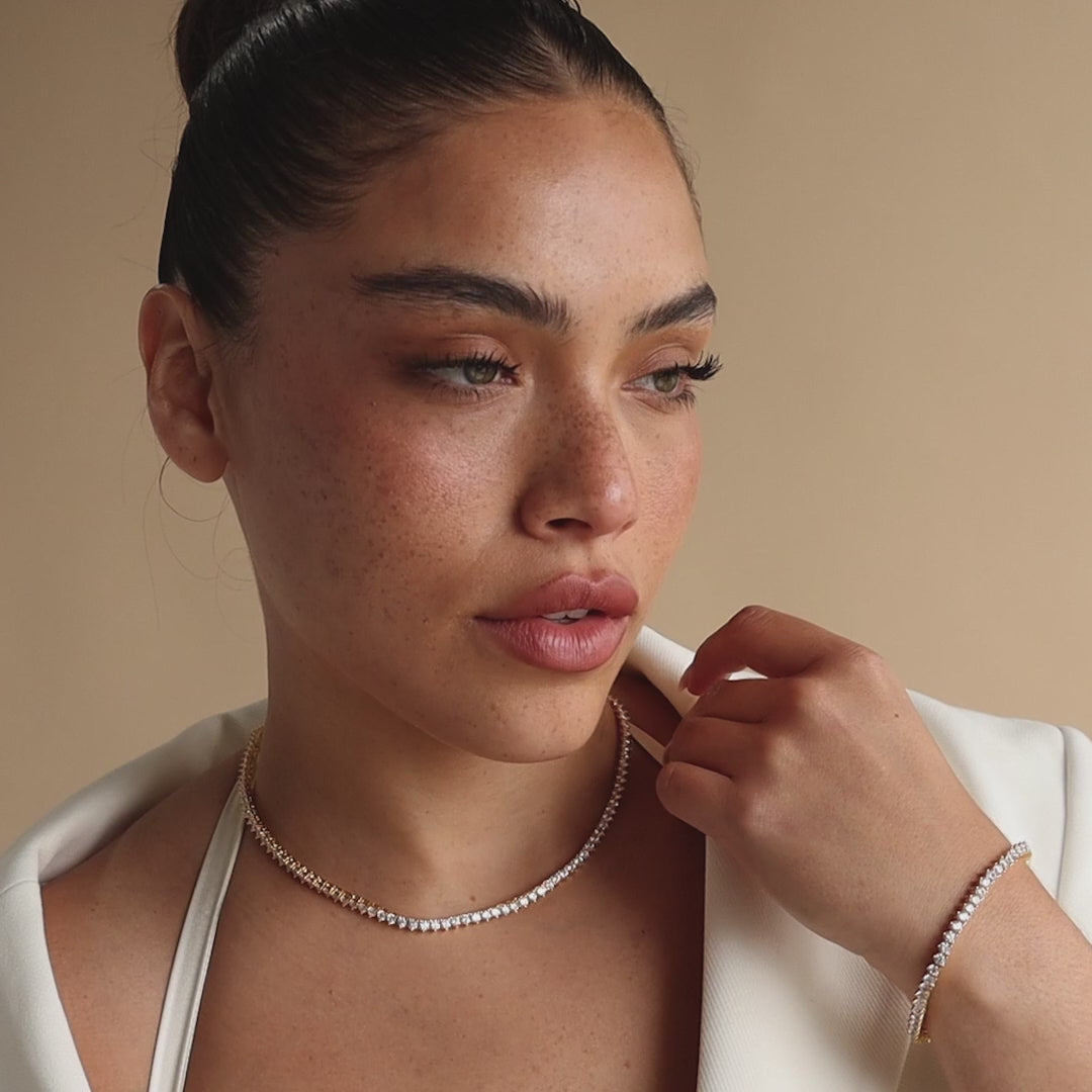 Our Bold Diamond Tennis Necklace is the only thing you will want to accessorize with. The glimmer of the diamond gemstones and the daintiness of the chain will put you in the spotlight when you want to be. Wear this beautiful necklace to a wedding or a date night; you will be sure to stand out ♡
