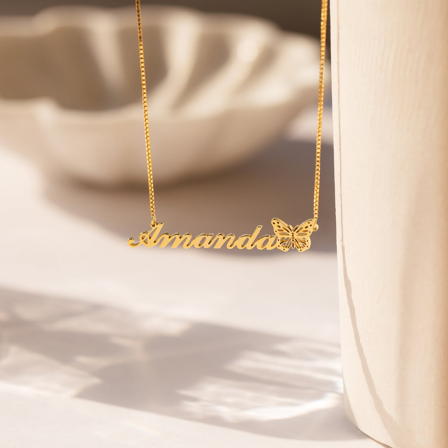 The Butterfly Name Necklace in Box Chain features the name Amanda and a delicate butterfly charm, beautifully catching soft sunlight.