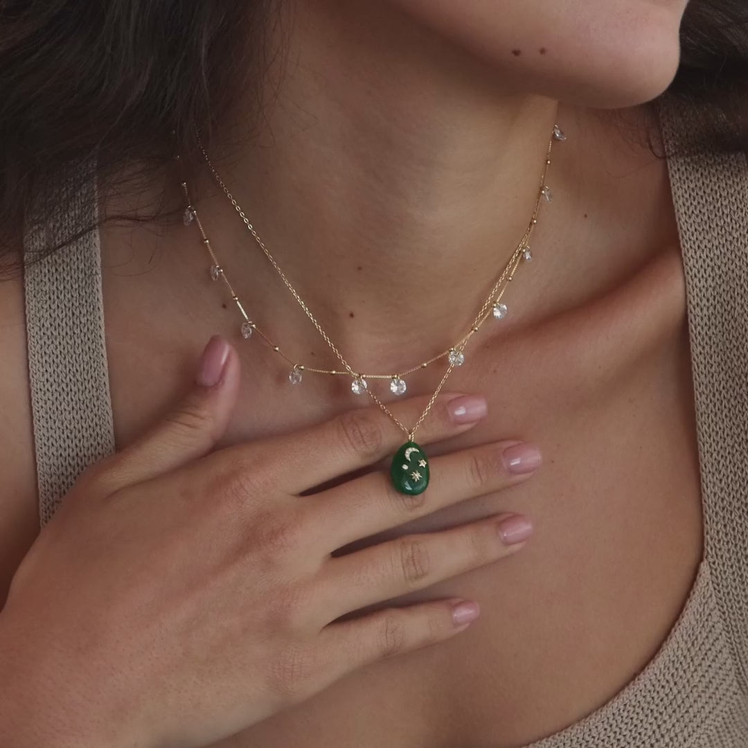 Inspired by the harmony of earth and sky, our Celestial Gemstone Pendant Necklace features a green gemstone adorned with sparkling stars and a crescent moon. Its serene, gentle glow feels like carrying a touch of starlight close to your heart.