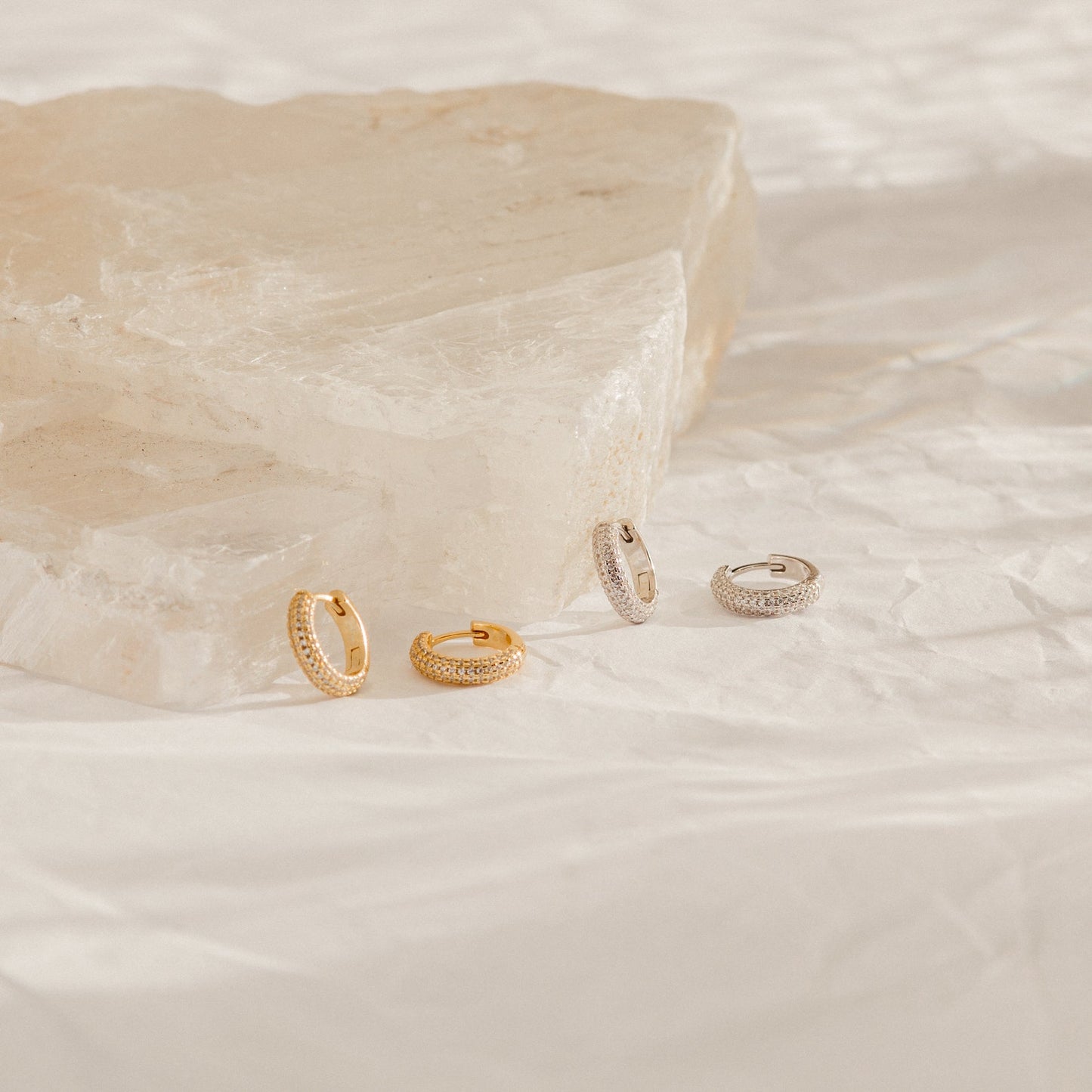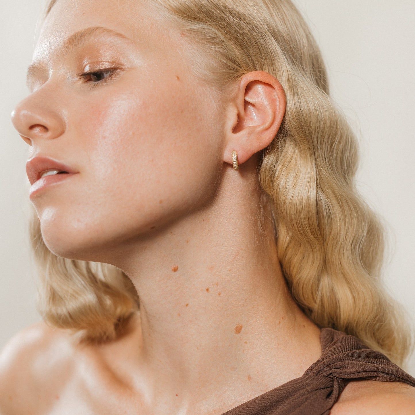 Elevate your date night outfit by adding a delicate sparkle with the Clarissa Pave Huggies. The half-dome hoops are adorned in tiny diamonds, perfectly placed to hit the light and glisten with every turn.