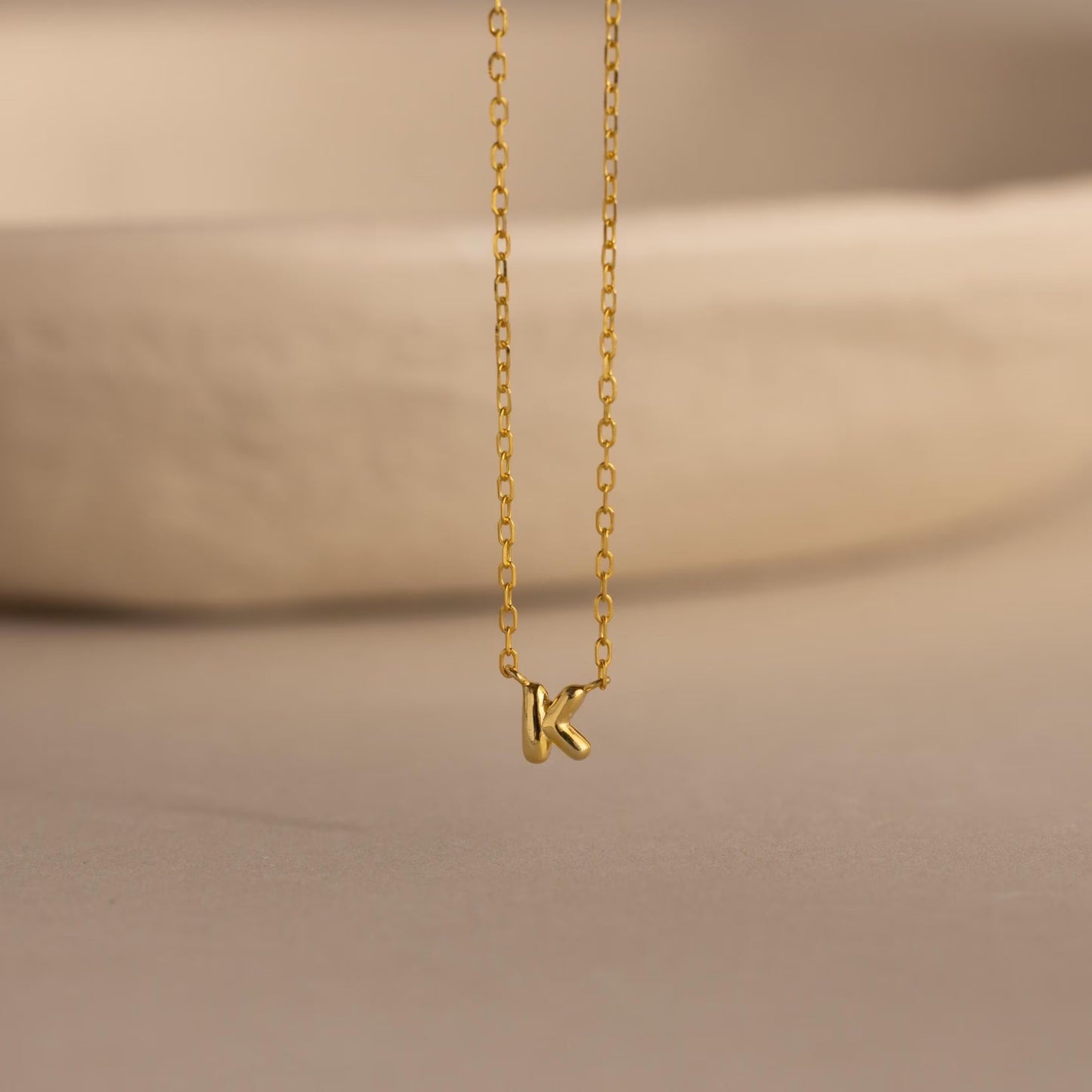 Close-up of the gold Custom Bubble Initial Necklace with the letter K, displayed on a neutral surface.