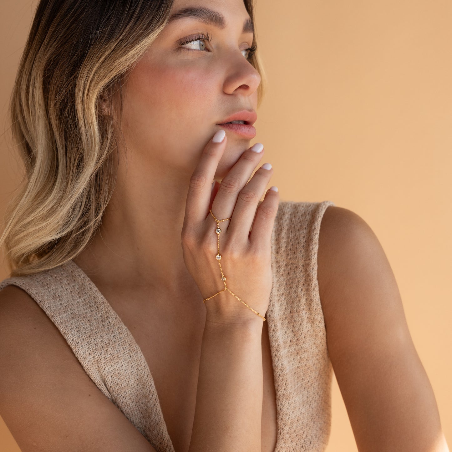 A woman wears the Diamond Bezel Hand Chain, adorned with small gemstone accents, as she rests her hand on her chin.