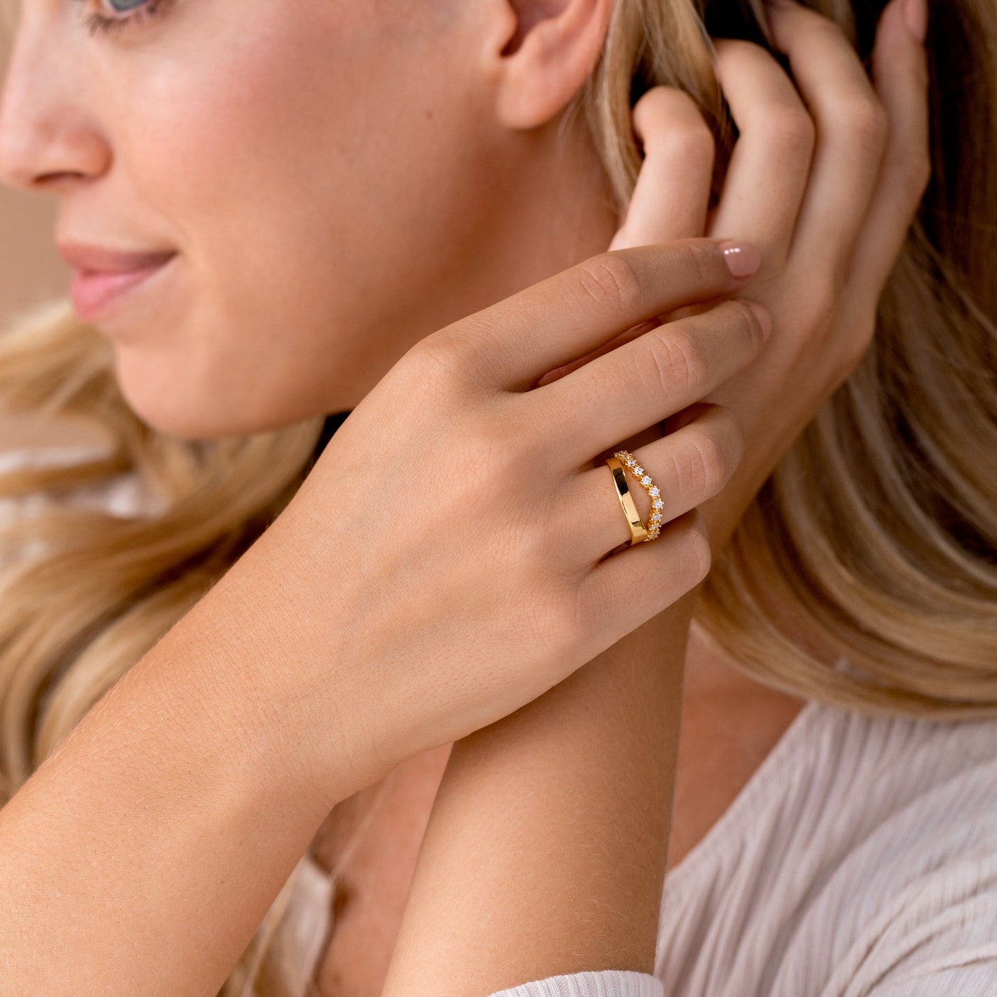 Our Wave Diamond Duo Ring is a statement piece, with a wave and diamond band bonded together onto the center of the ring. This stacking ring is truly elegant and can be worn alone or with other minimalist rings. Whether you're celebrating an engagement or a wedding, this delicate and dainty promise ring is perfect for everyday wear.