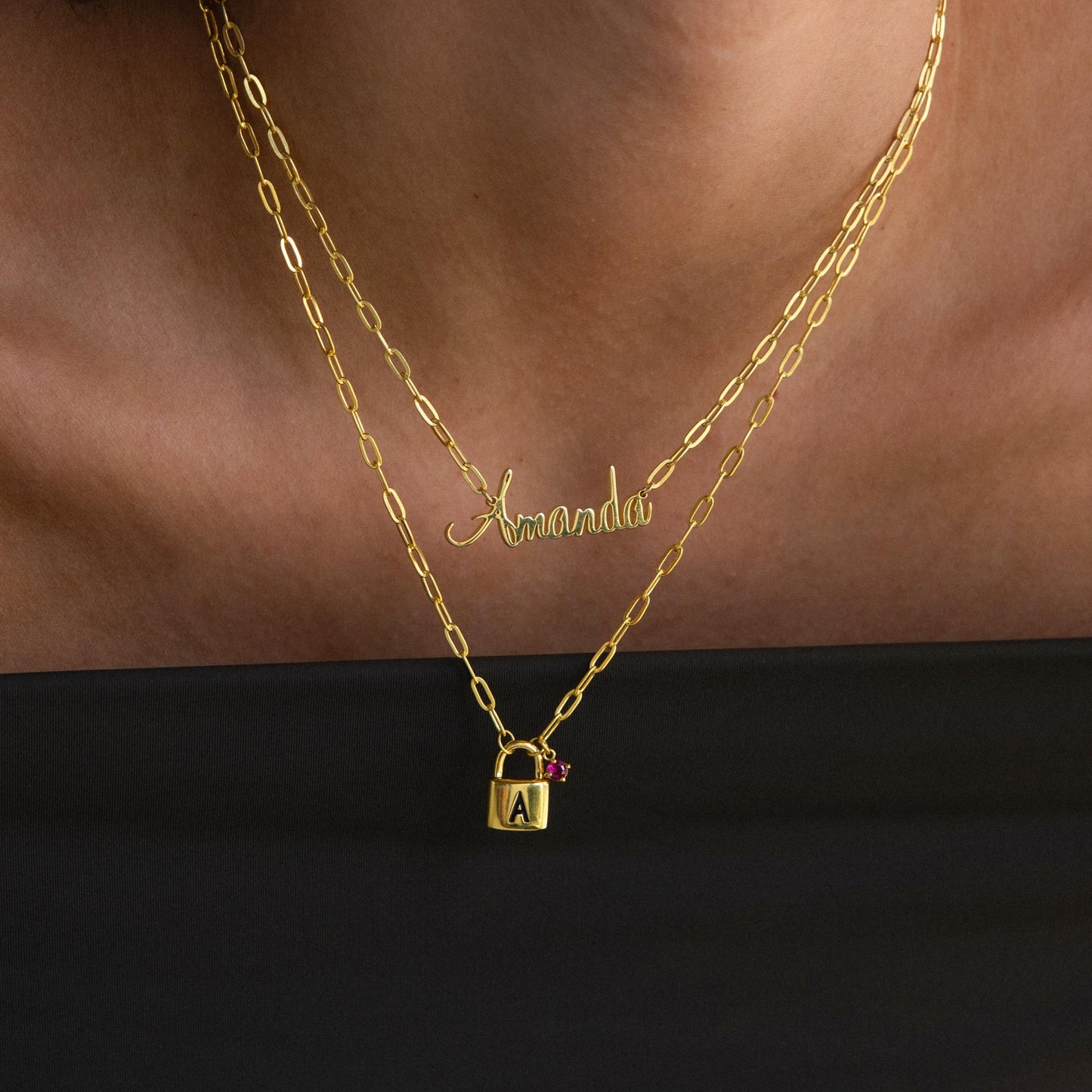 Celebrate love and individuality with our Initial Birthstone Padlock Necklace. Perfect for commemorating milestones, this piece allows you to customize the initials as well as the birthstone for this pendant necklace. Personalize this timeless gift to create something not only meaningful but perfect for everyday wear.