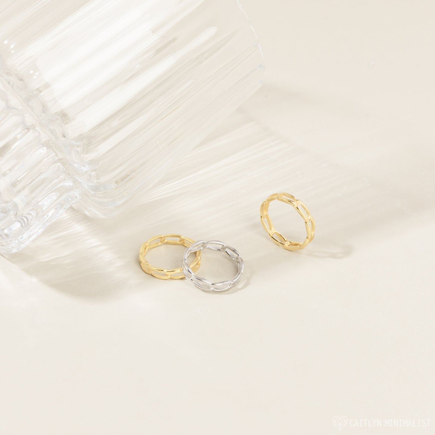 A single link ring displayed on a soft, neutral-toned surface—showcasing its minimalistic 3 mm band and polished finish.