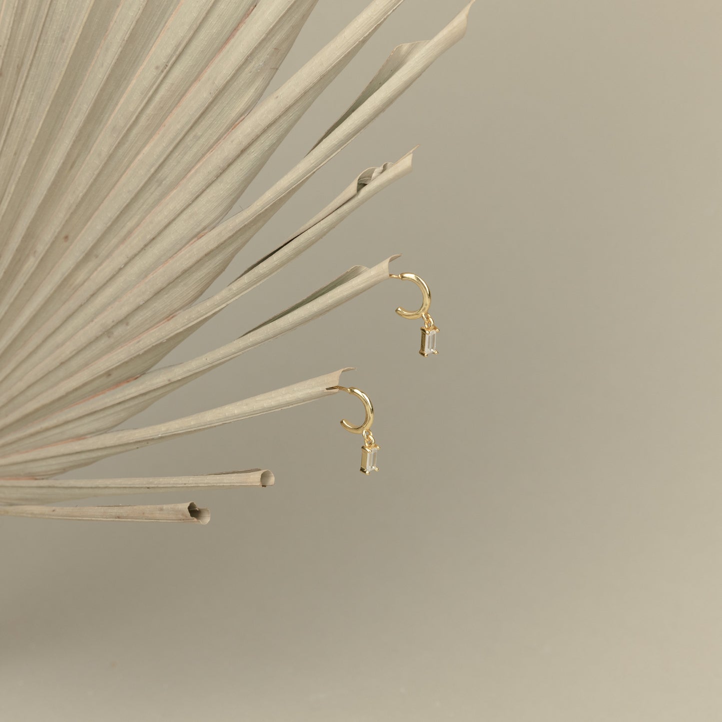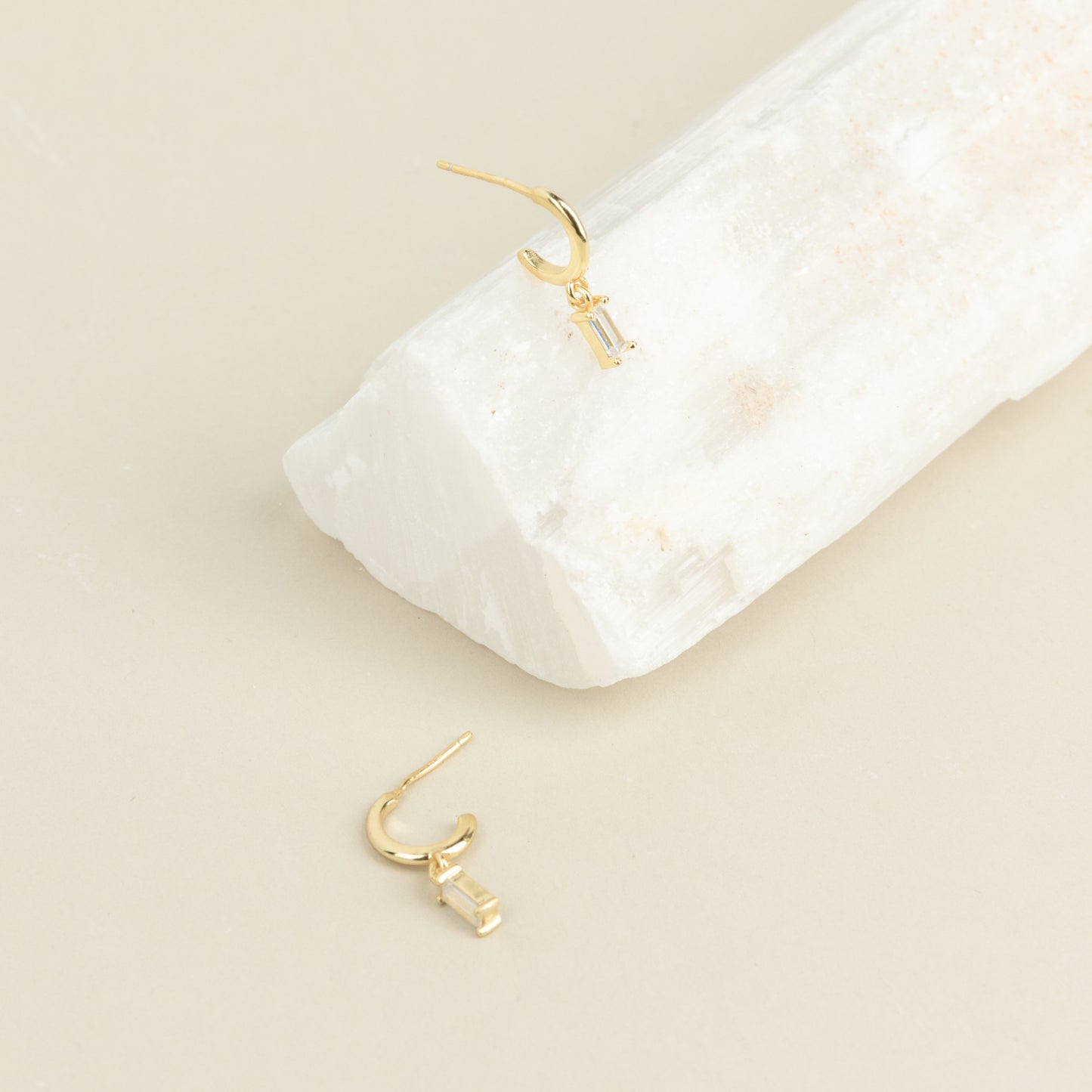 Lys Baguette Hoops feature gold earrings with rectangular crystals, capturing classic elegance and displayed on a white stone slab against a beige background.