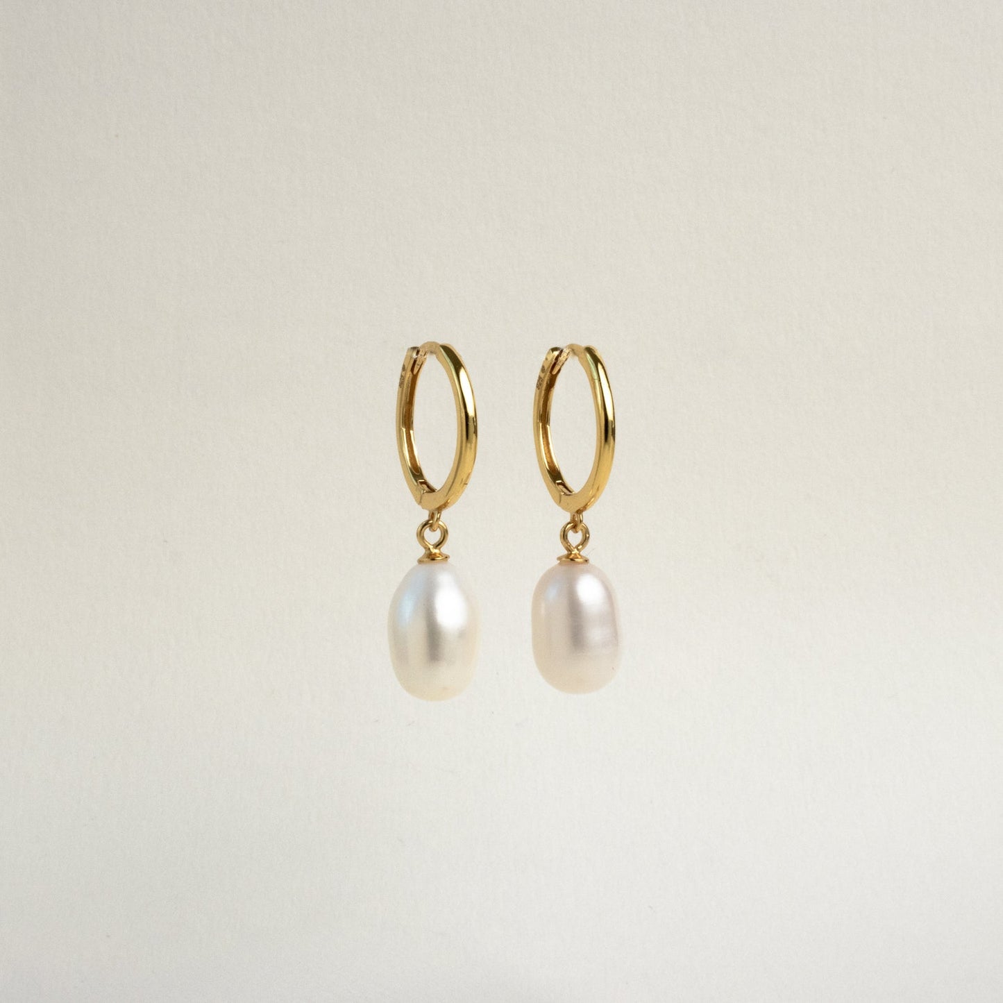 Maggie Pearl Drop Hoops—gold hoops with dangling white pearls—are shown on a light textured stone surface, making them the perfect minimal jewelry piece.