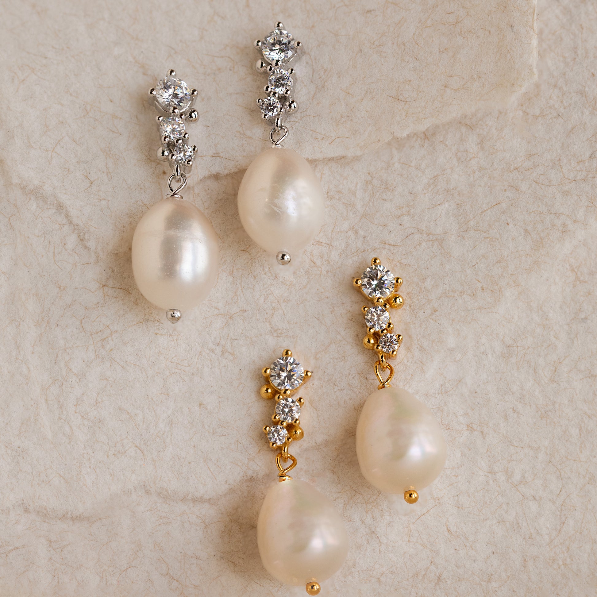 A close-up image of a pair of elegant drop earrings featuring three sparkling round-cut cubic zirconia stones set vertically in gold-toned prongs. Dangling below each cluster is a lustrous, organically shaped baroque freshwater pearl with a warm creamy tone