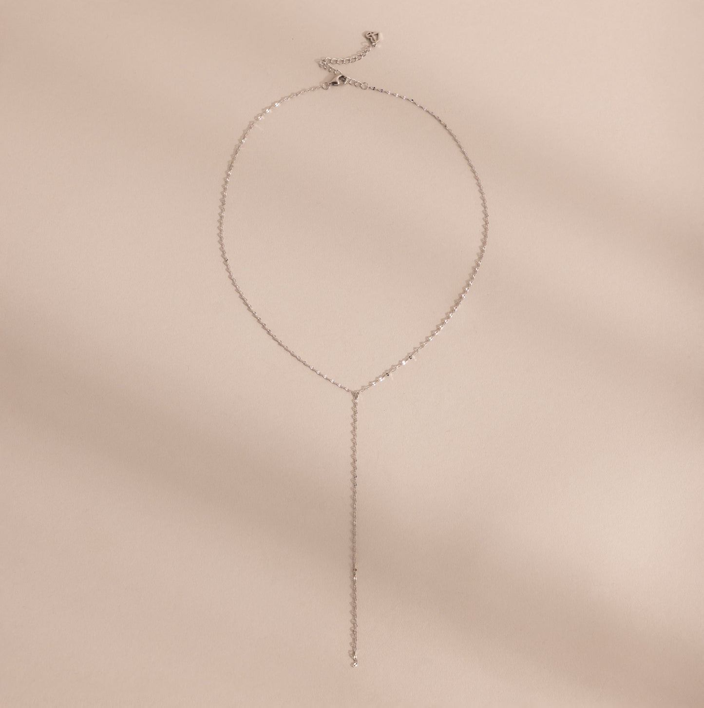 Silver mirror chain lariat necklace displayed on a neutral background.
