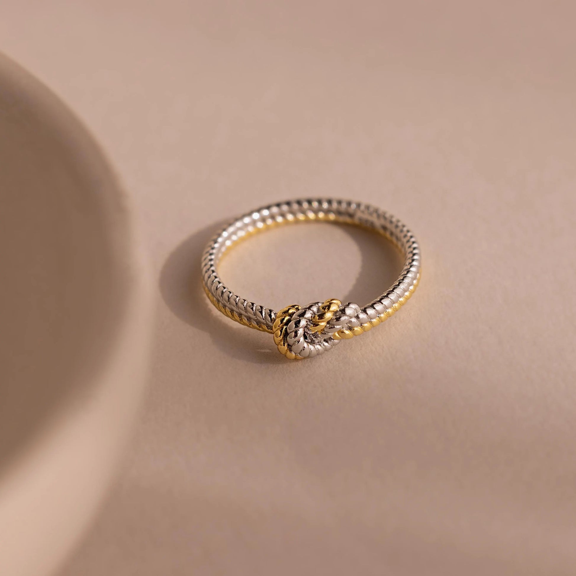 The Mixed Metal Knot Ring, ideal as a relationship gift, features gold and silver twists and rests elegantly on a textured beige surface.