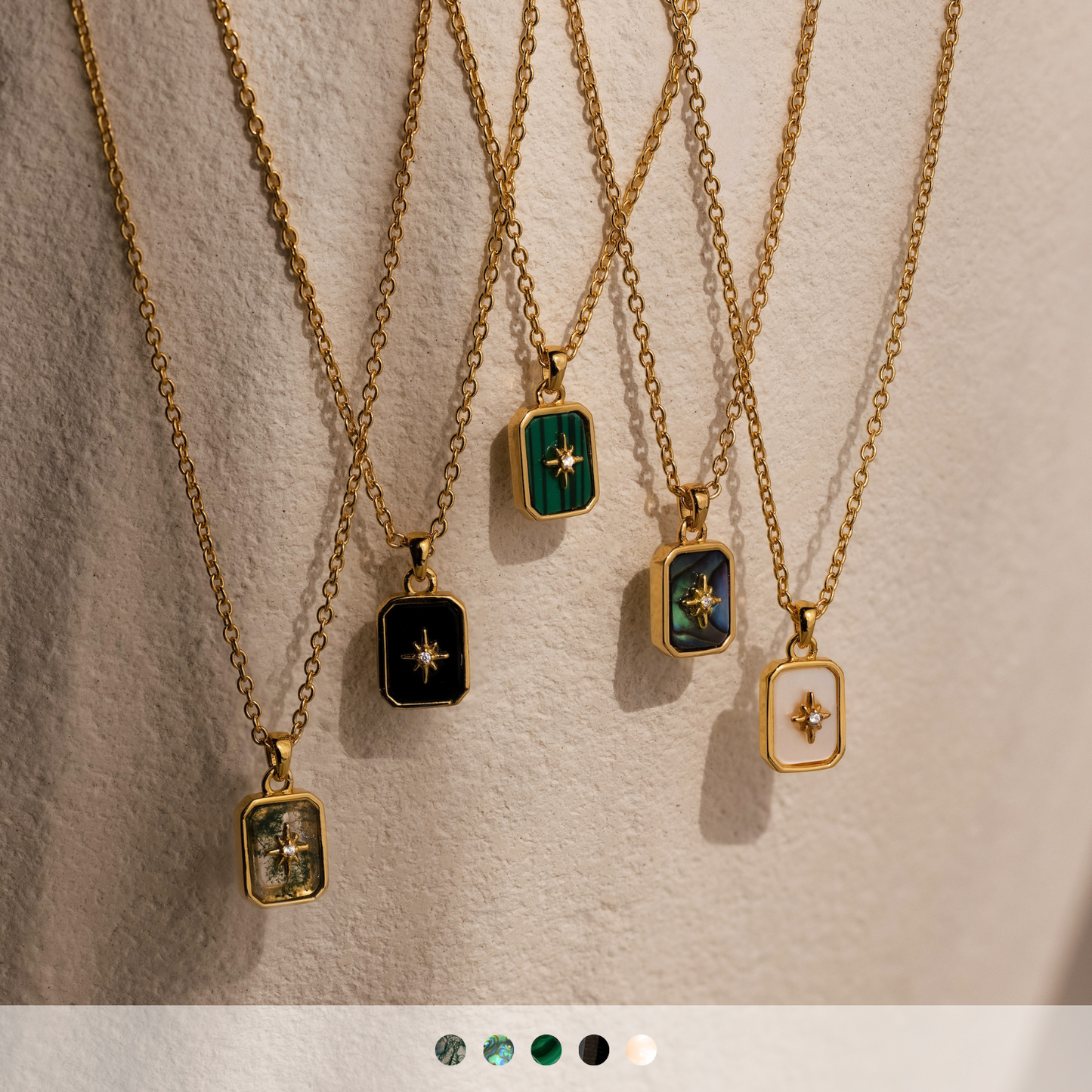 Five North Star Gemstone Necklaces in 18K Gold, each featuring a rectangular crystal pendant, are displayed against a soft beige background.