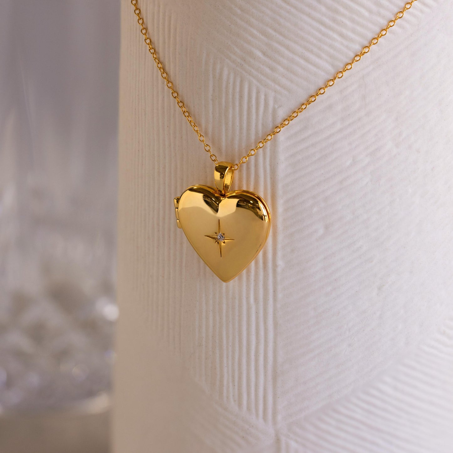 A gold heart-shaped locket with a north star CZ diamond in the center on a delicate cable chain.