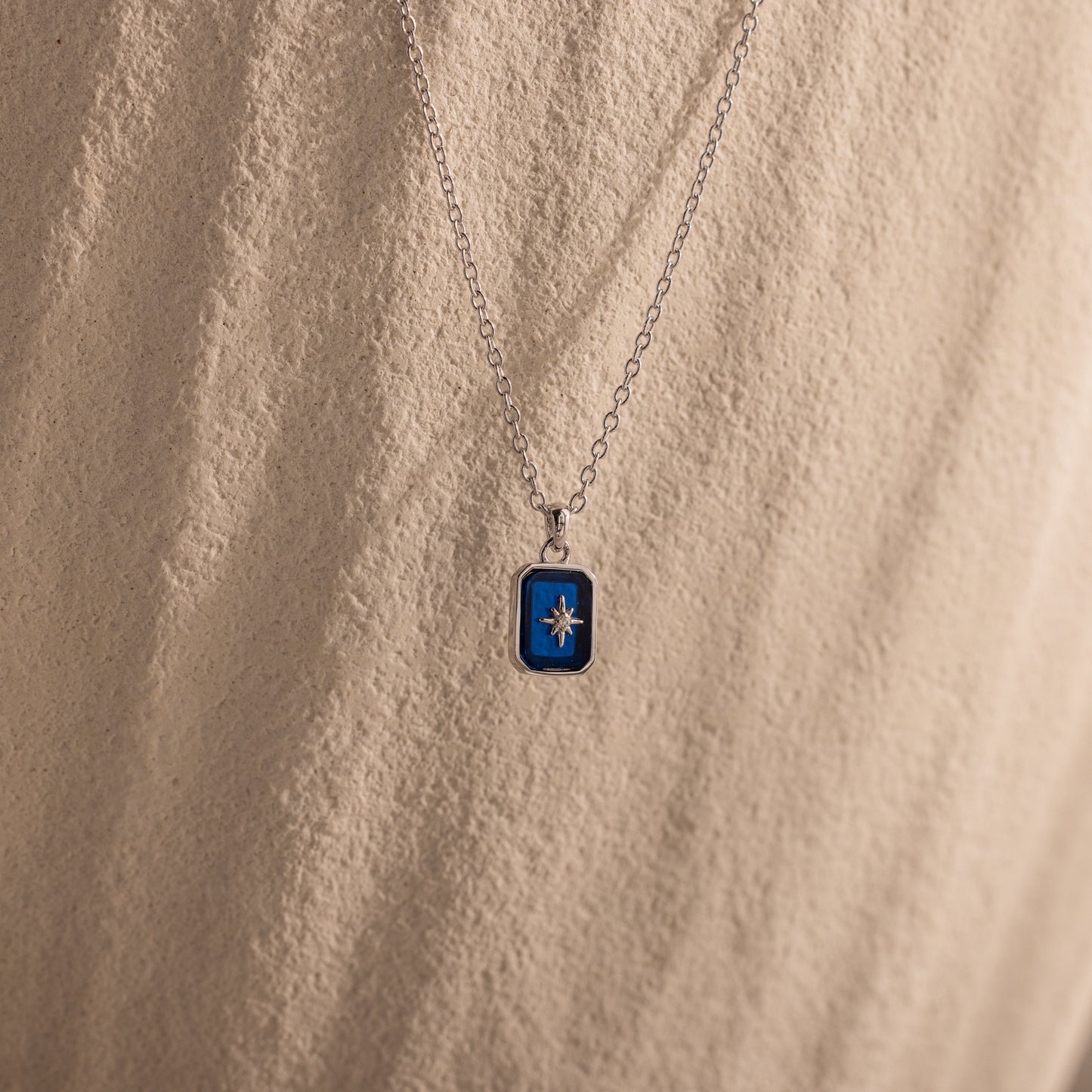 The North Star Birthstone Necklace in sapphire for September features a rectangular dark crystal pendant with a diamond-set North Star, displayed on a smooth beige surface.