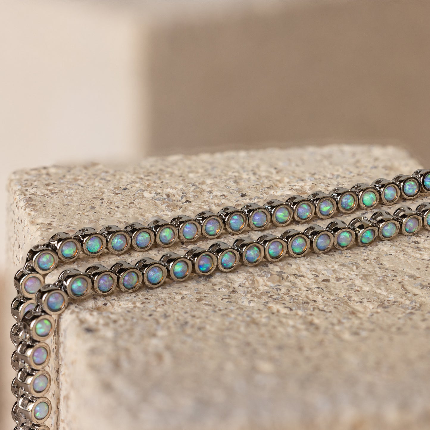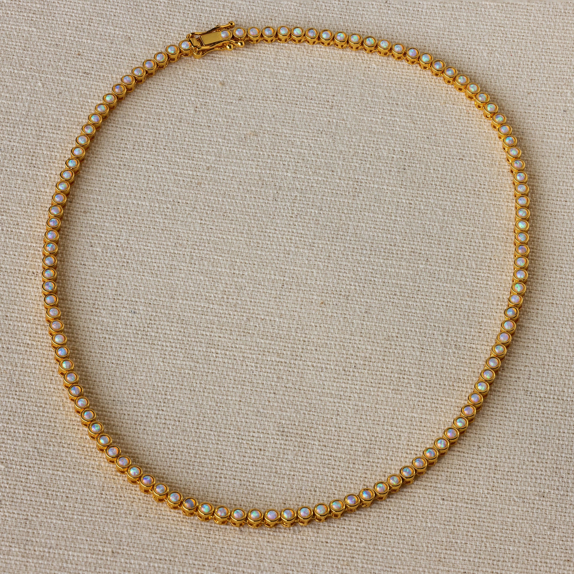 The opal beads really catch the light, similar to rainbow moonstone. This would be my favorite necklace if the whole second back half of the bezel setting was gone. It's useless and makes the necklace twice as thick. In other styles, it let's in light so the gems sparkle. In this one, they're closed off. It wouldn't roll as much if it weren't so thick.