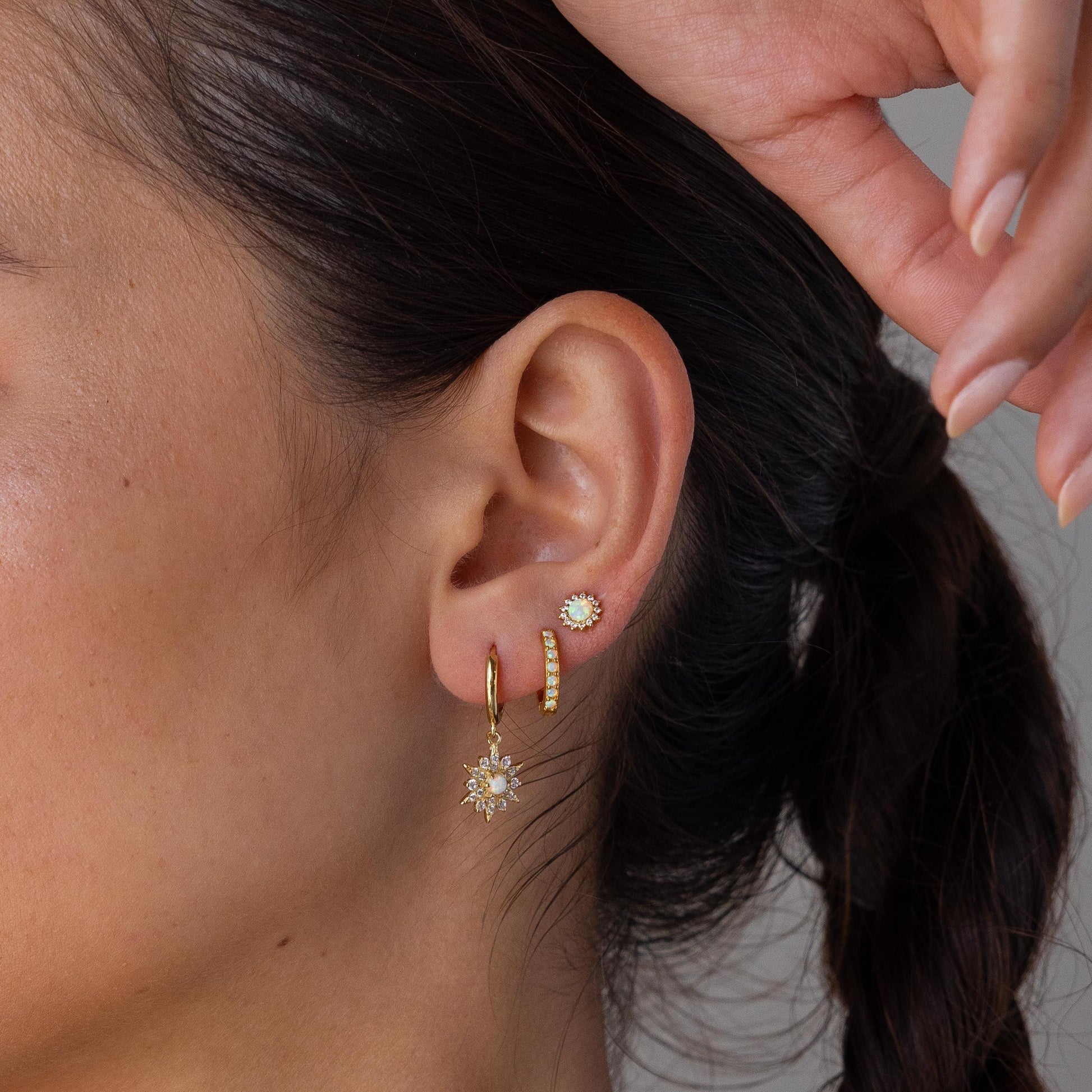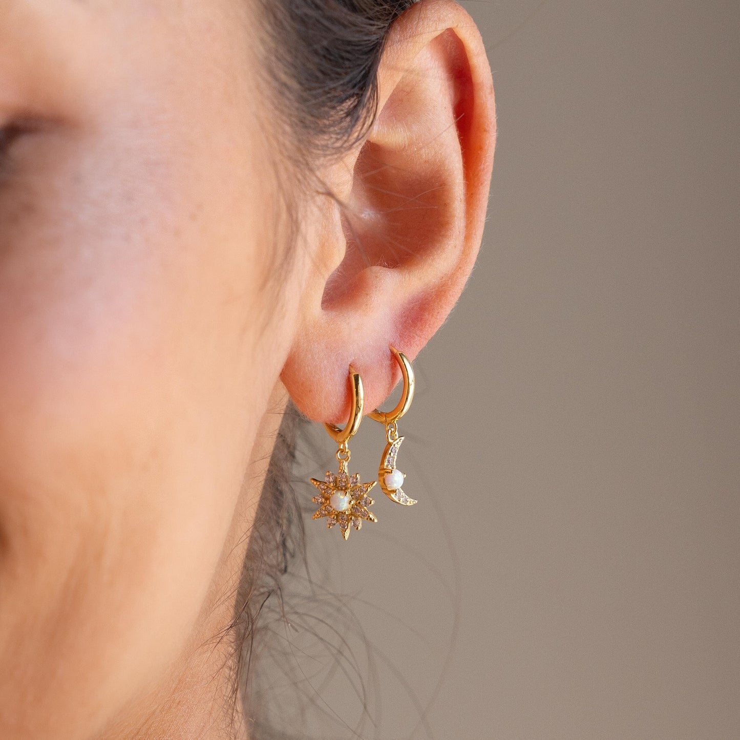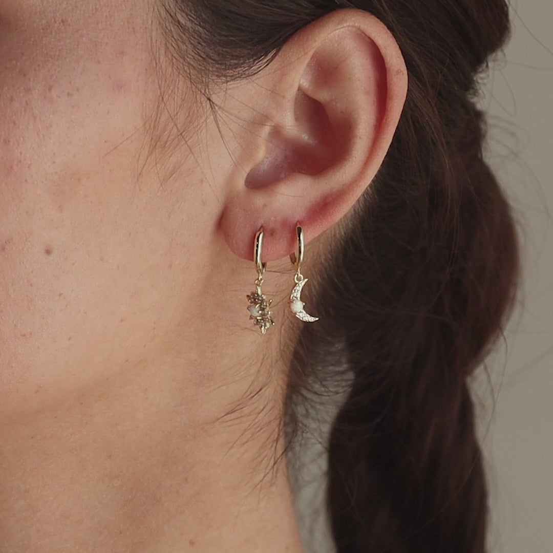 Embrace the magic of day and night with our Opal Sun & Moon Huggies, a unique mismatched pair inspired by the cosmic bond between the sun and moon. Perfect for adding a whimsical yet refined touch to any outfit, they’re a dreamy accessory for lovers of all things cosmic and chic.
