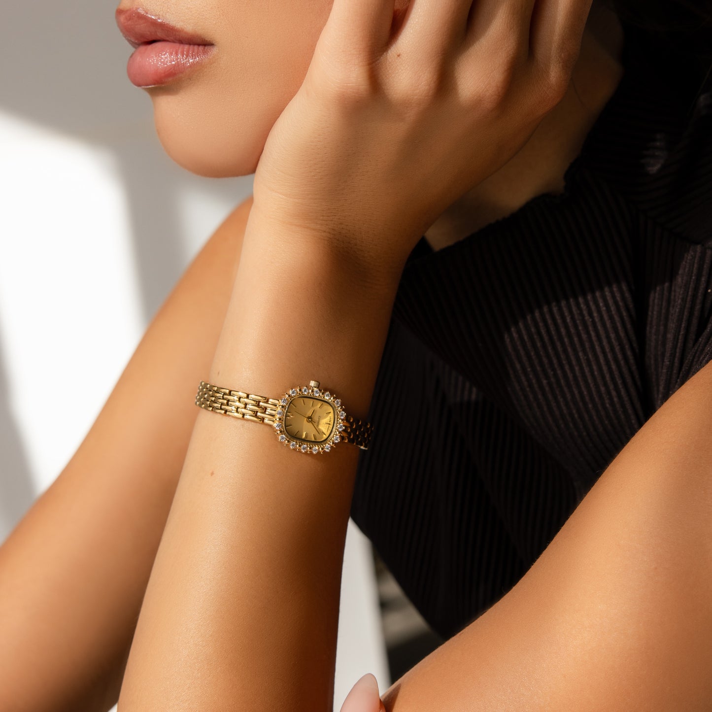 Our Pave Blossom Timepiece is a stunning watch with a face encrusted in shimmering pave CZ diamonds, radiating timeless elegance. Perfect for adding a touch of sparkle to your everyday moments or elevating your evening looks ✨