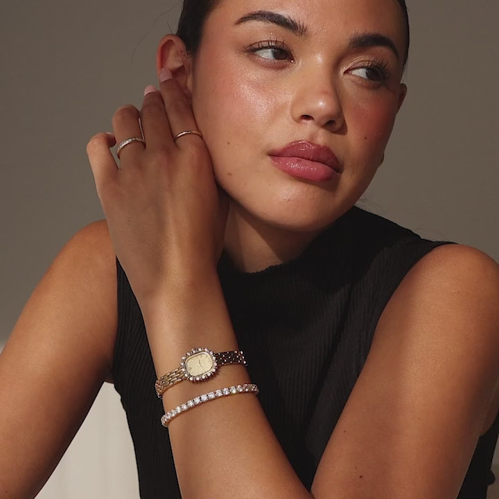 Our Pave Blossom Timepiece is a stunning watch with a face encrusted in shimmering pave CZ diamonds, radiating timeless elegance. Perfect for adding a touch of sparkle to your everyday moments or elevating your evening looks ✨