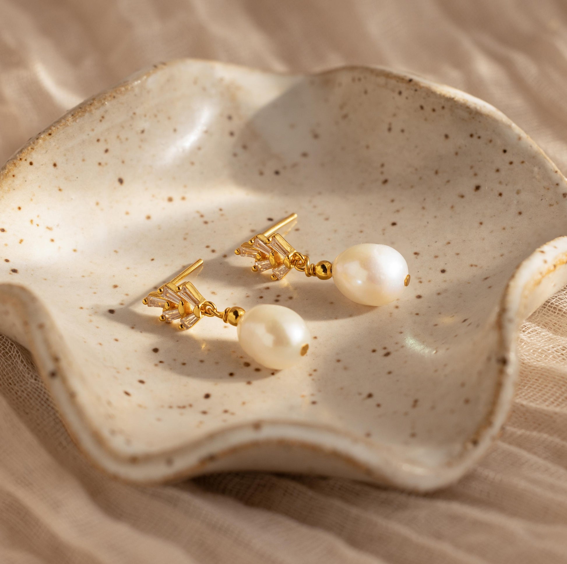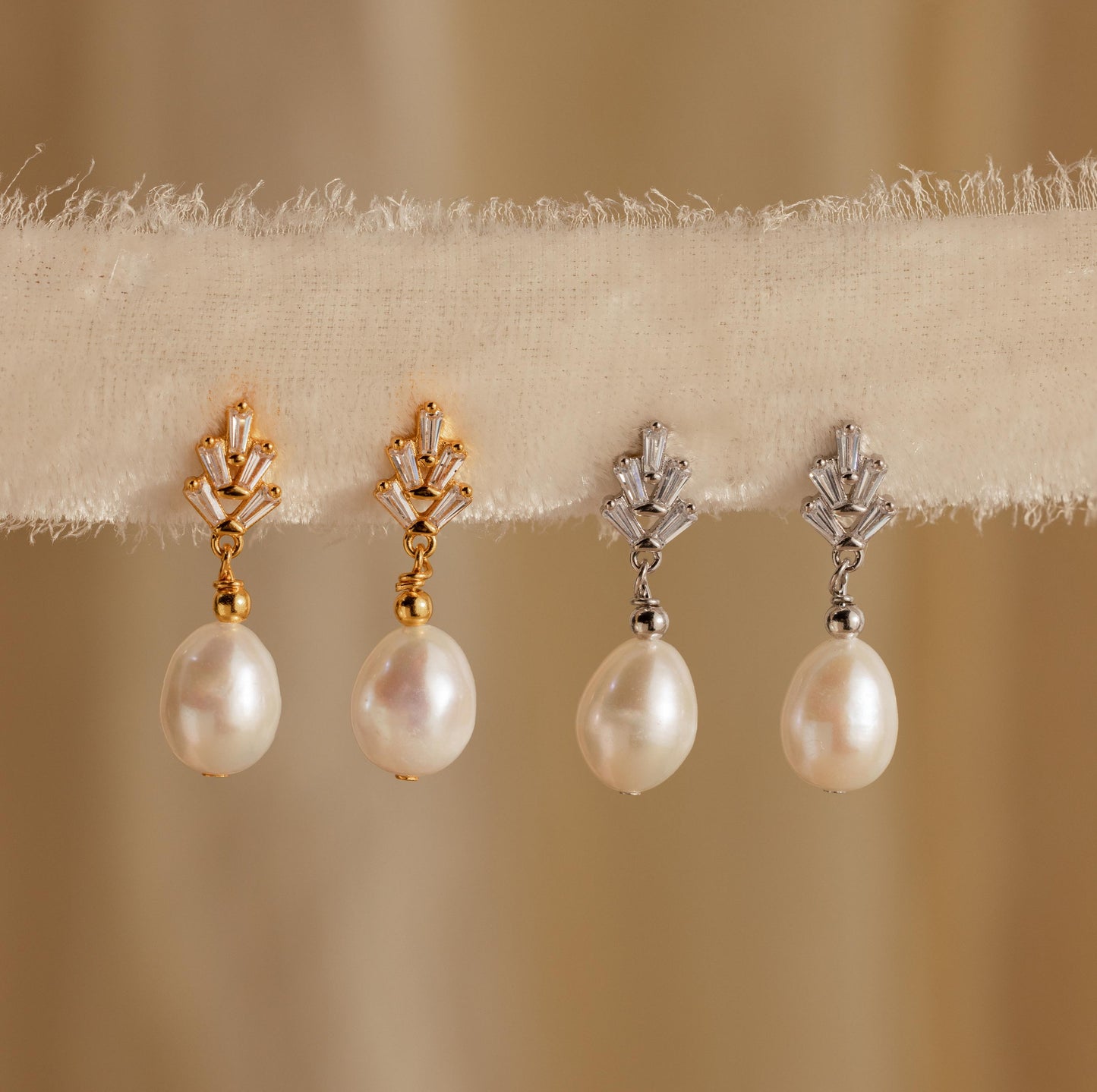 Our Pearl Diamond Drop Earrings brings together art deco charm with wintery glow. With sparkling diamond baguette studs and a timeless pearl drop, they’re perfect for capturing that frosty, vintage-inspired vibe. Whether it’s your big day or a winter celebration, these earrings are pure magic.
