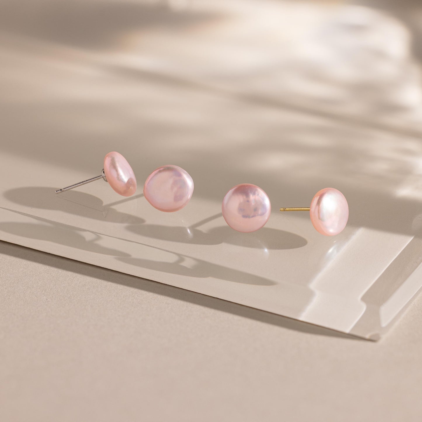 Pink Pearl Studs featuring blush tone freshwater pearls are displayed on a beige surface, accented by sheer beige fabric strips.