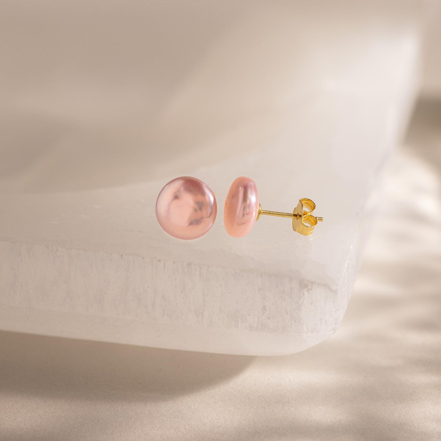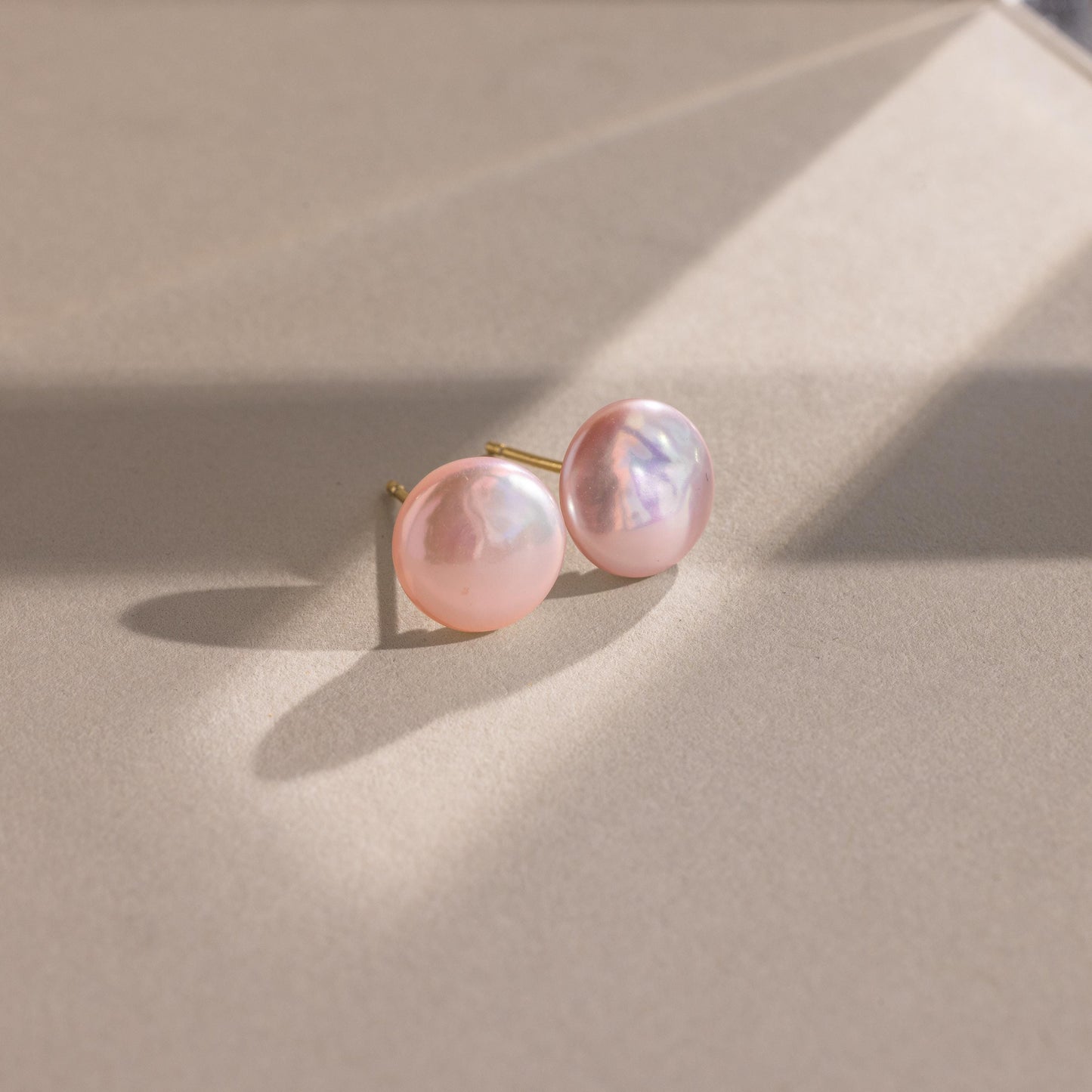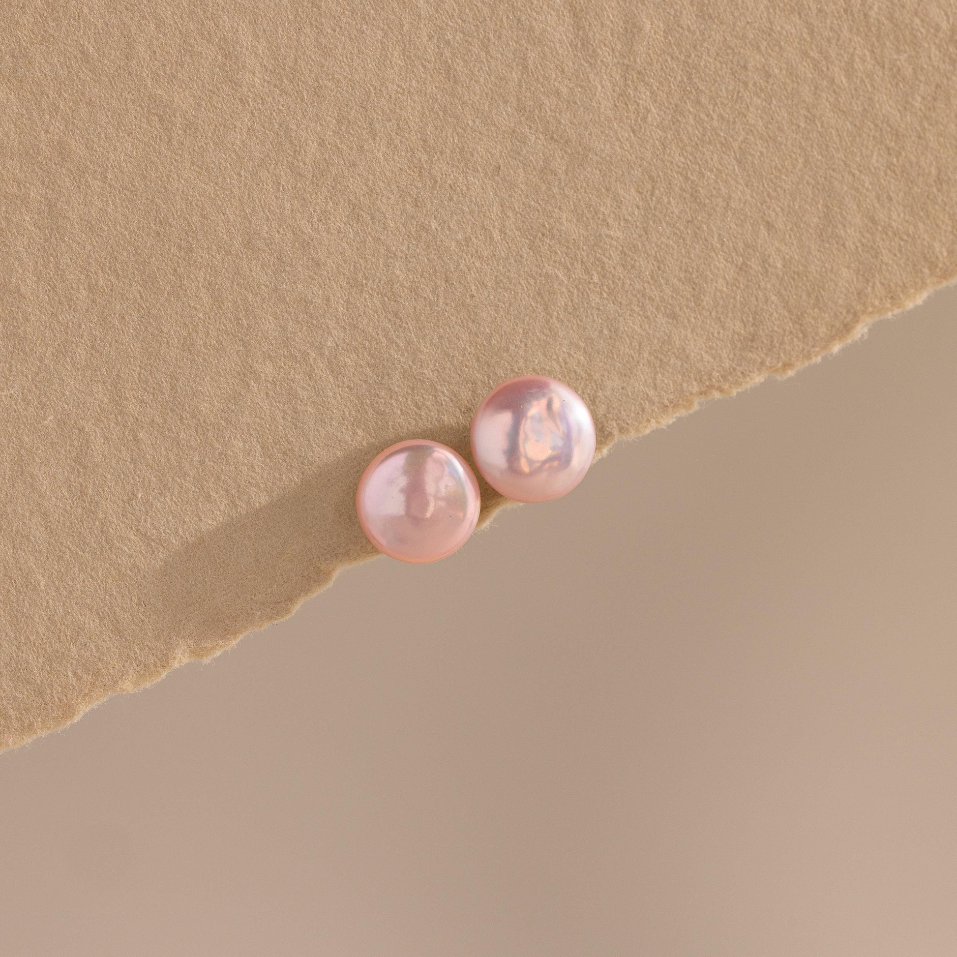 Pink Pearl Studs featuring blush tone freshwater pearls are displayed on a beige surface, accented by sheer beige fabric strips.