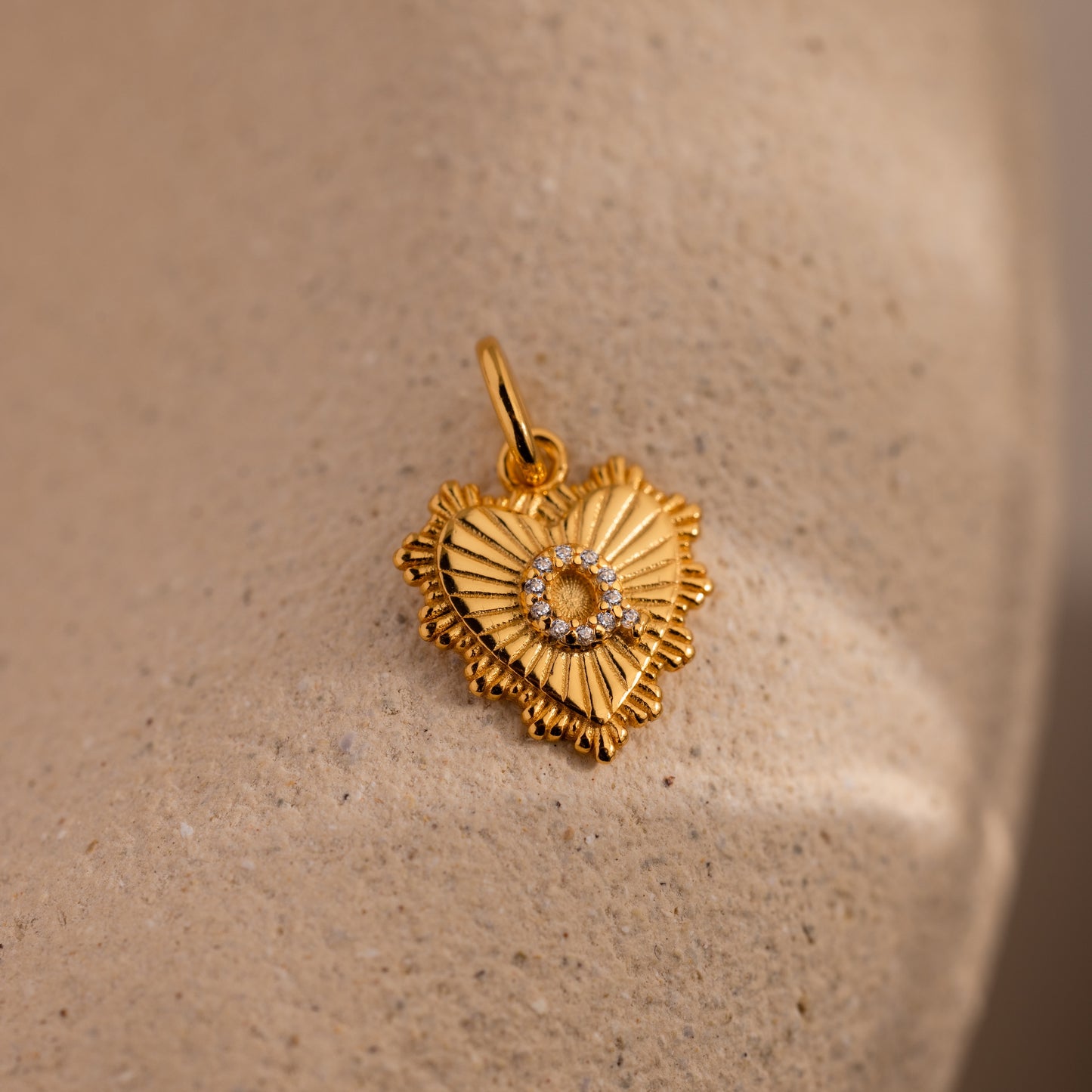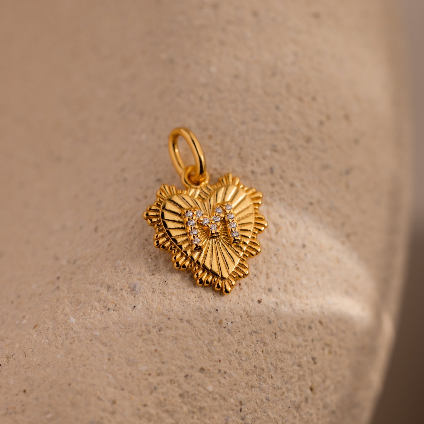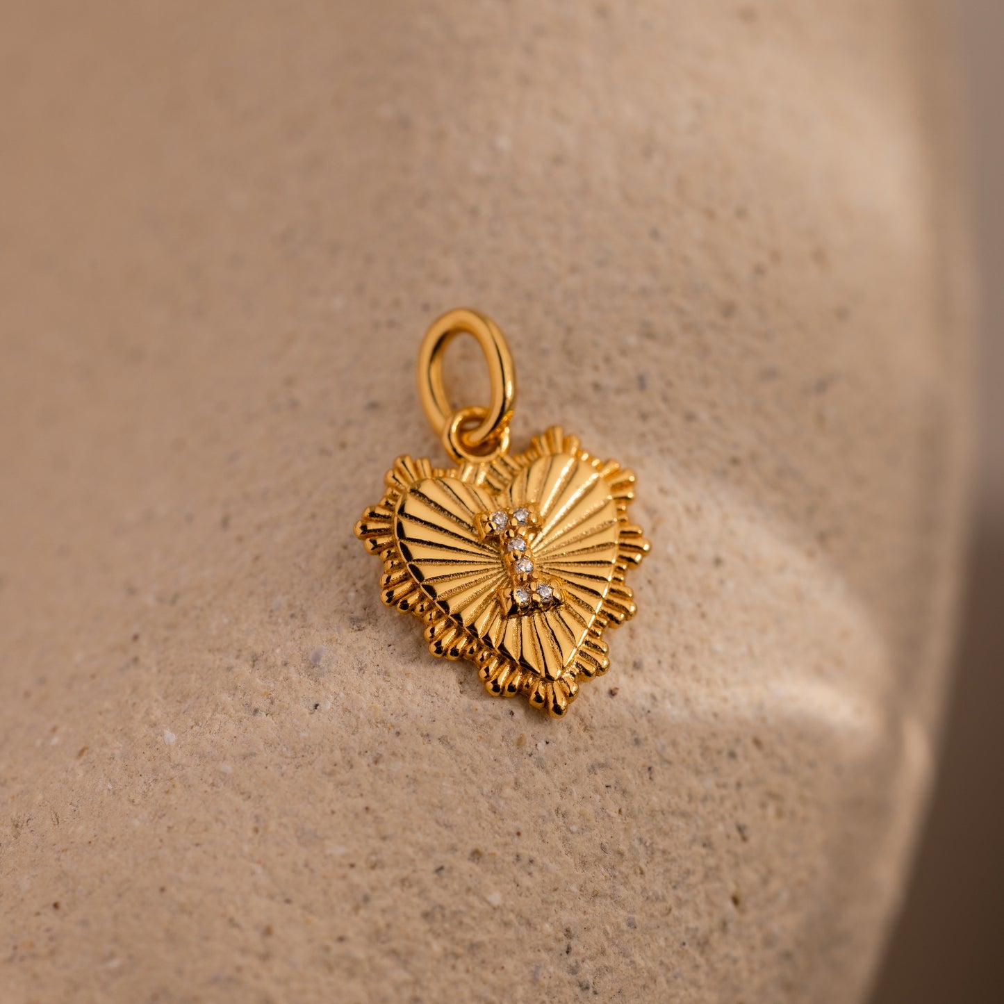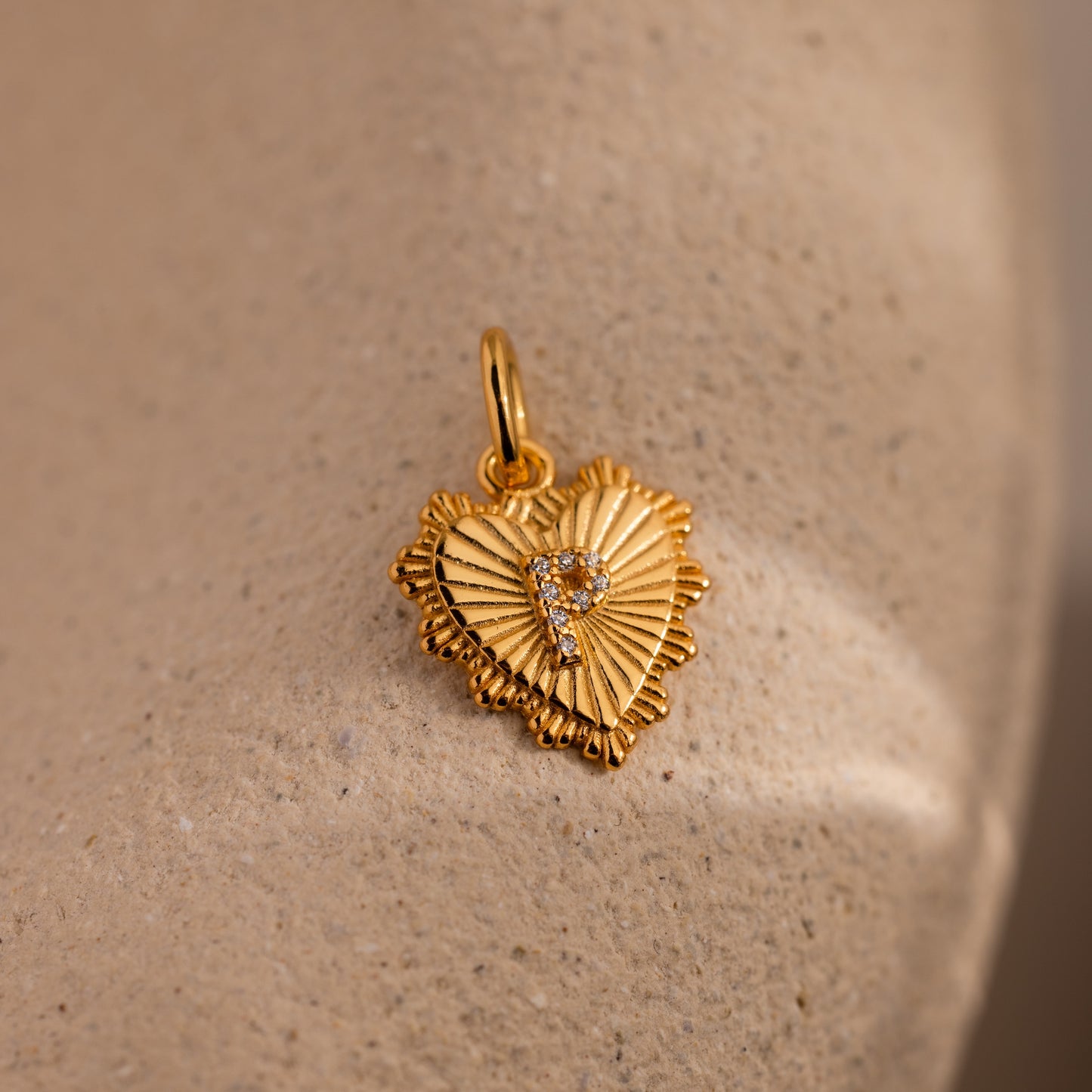 The Ribbed Heart Pave Initial Charm—a gold, heart-shaped pendant with textured ribbing and sparkling crystals—rests on a beige stone surface, making it an ideal choice for lovers of personalized jewelry.
