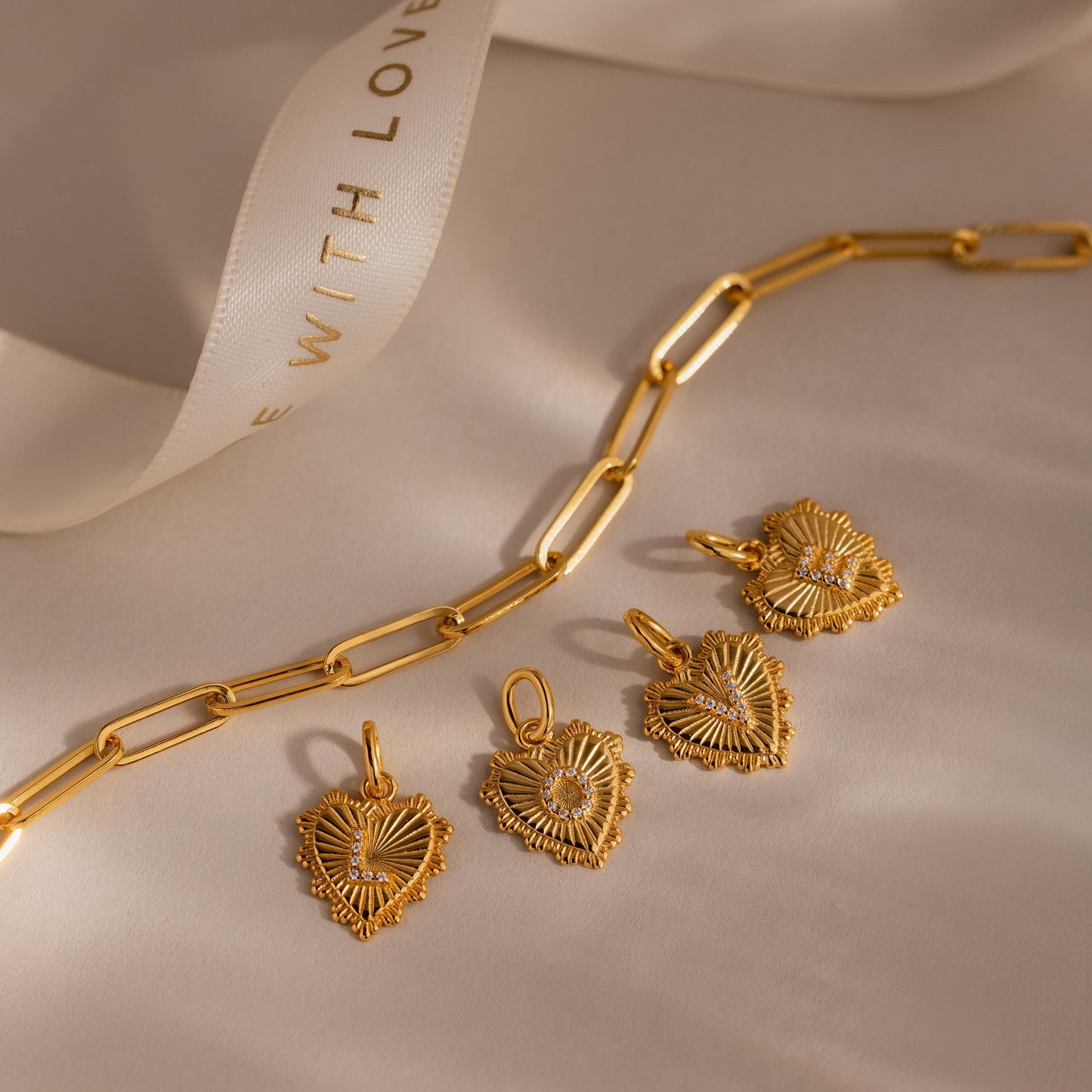Make it personal with our Ribbed Heart Pave Initial Charm, where timeless charm meets meaningful detail. Featuring every letter of the alphabet, each gold heart is beautifully ribbed and set with a shimmering initial to represent you or someone you love  ♡