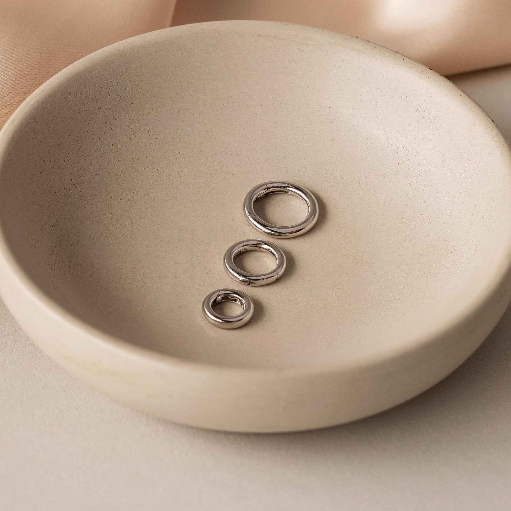 The Round Carabiner Charm Set in 18K Gold features three gold rings in varying sizes, ideal for charm necklaces or bracelets, pictured in a round ceramic dish on a soft beige background.