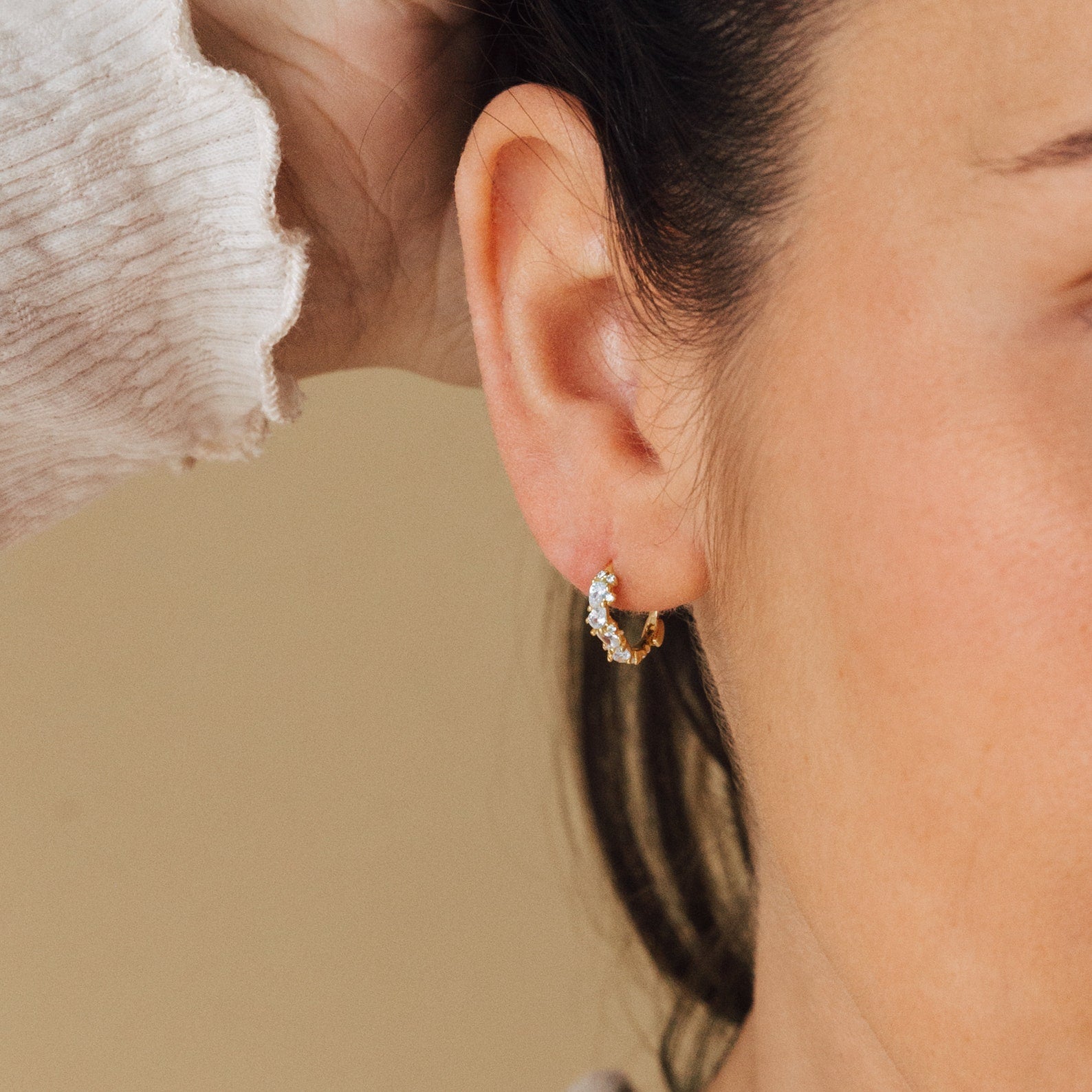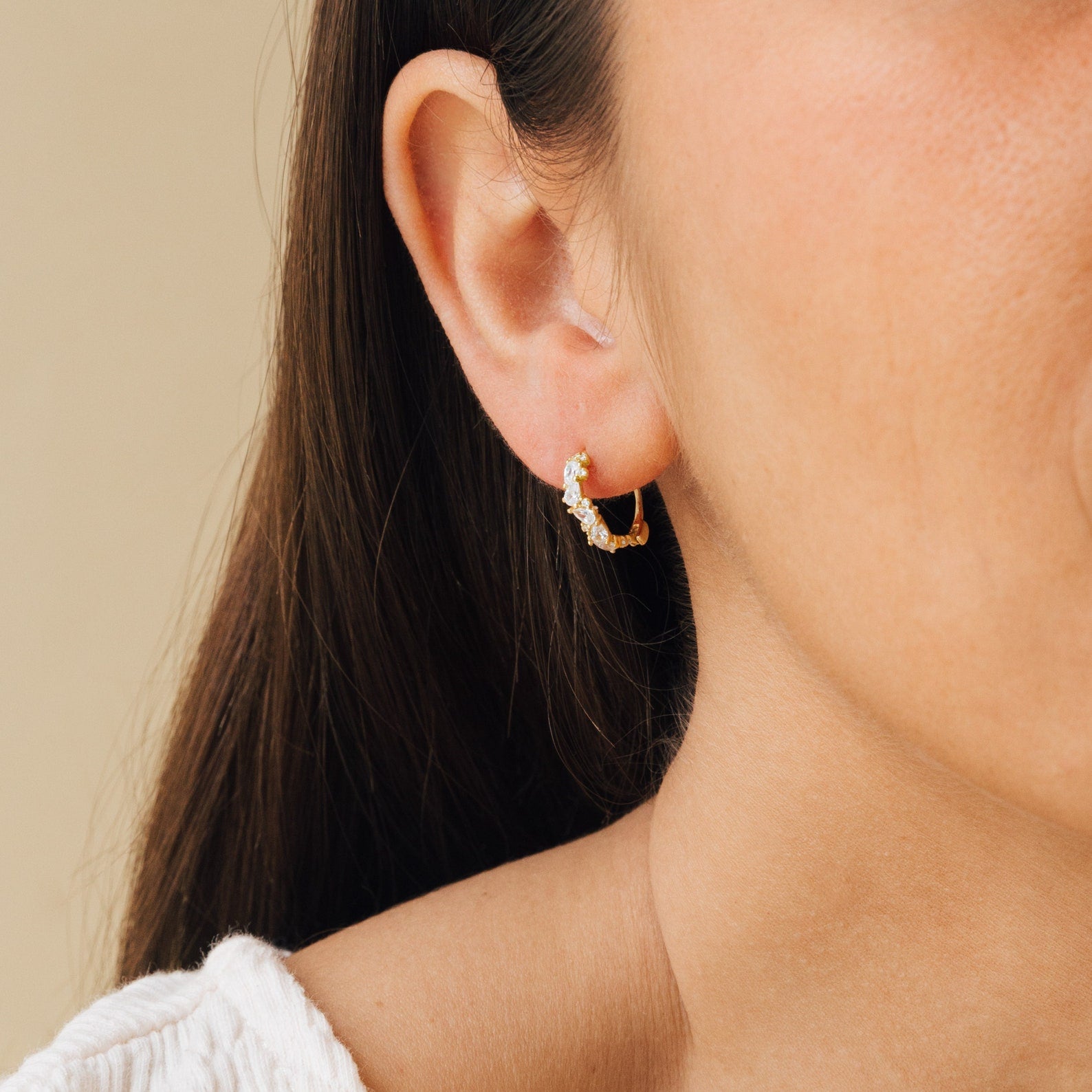Our Sprinkle Diamond Huggies feature pear-cut CZ diamonds to add extra shine to your everyday outfit. The unique placements of the stones in this design add a "sprinkle" effect to make for a subtle statement jewelry piece.