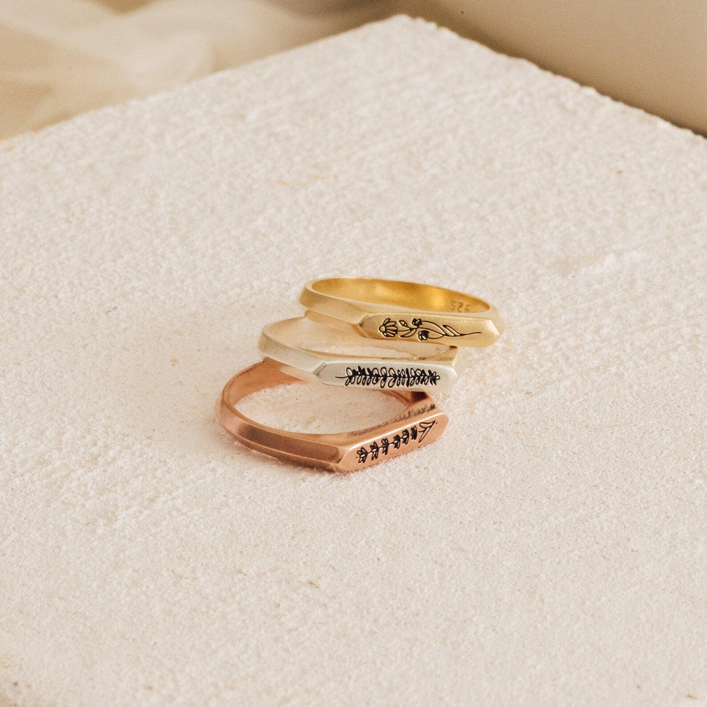 Elevate your style with our Custom Flower Signet Bar Ring, a minimalist engraved floral ring designed for a timeless, elegant look. Crafted in sterling silver, gold, and rose gold, this dainty personalized pinky ring features a delicate floral engraving, making it a meaningful birthday gift, nature-inspired keepsake, or everyday statement piece. Perfect for those who love botanical jewelry with a modern touch, this signet ring is a unique blend of sophistication and personalization.